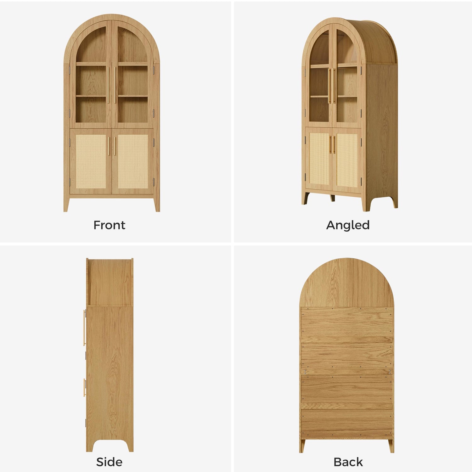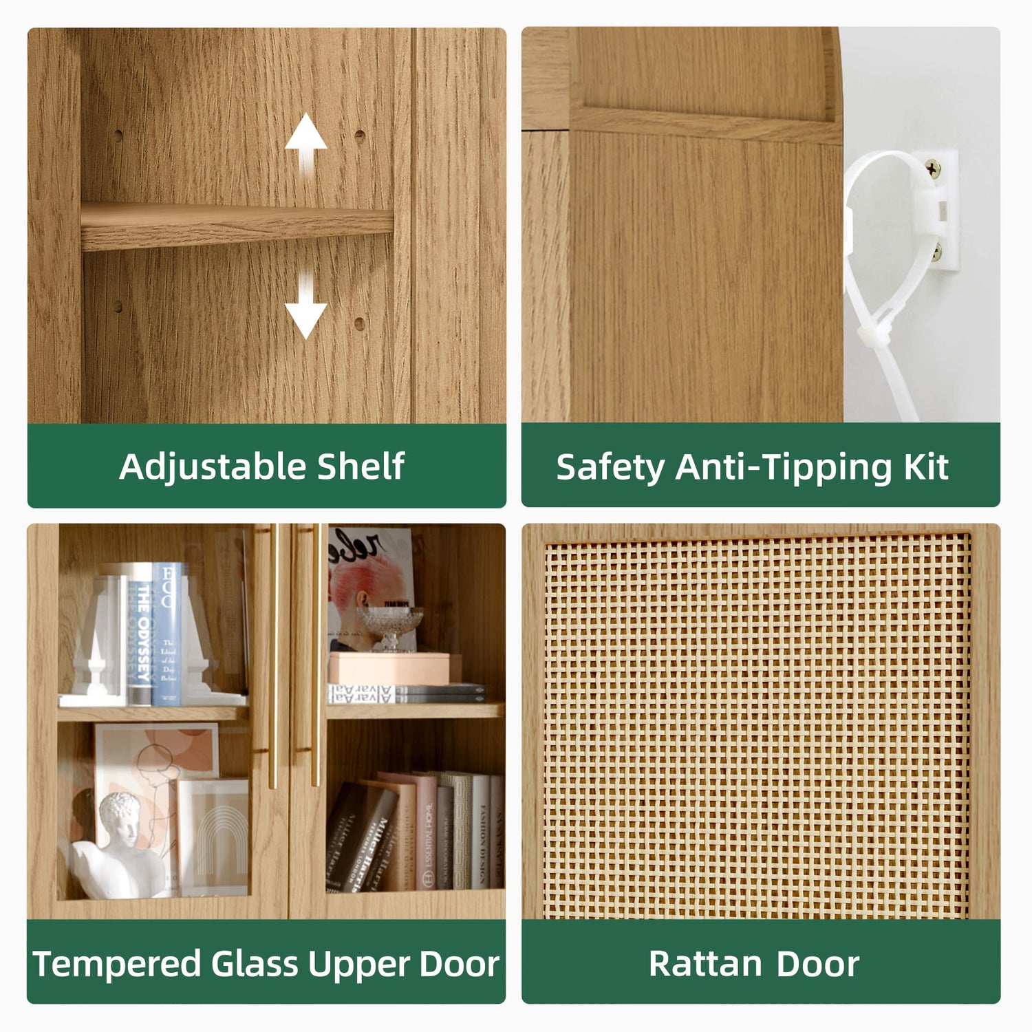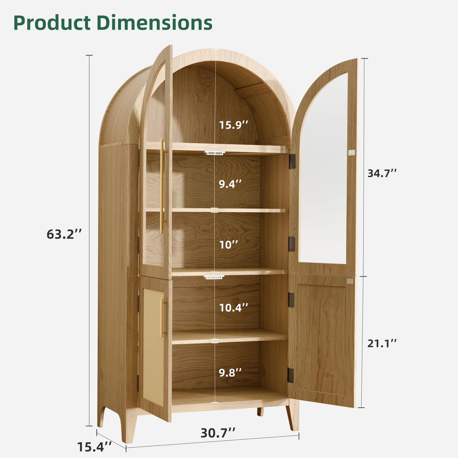 TRUNBACK 63" Arched Storage Cabinet, 5-Tier Modern Farmhouse Kitchen Pantry Cabinet with Glass & Rattan Doors, Adjustable Shelf for Living Room, Dining Room, or Office, Oak