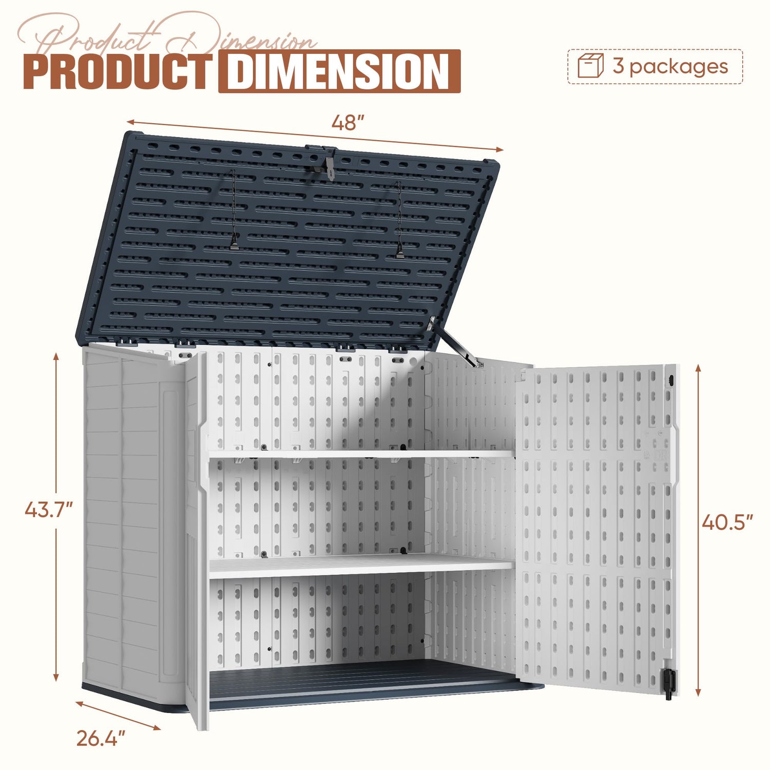 - Spacious Capacity: Measuring 48"L x 26.4"W x 43.7"H, this storage shed occupies 28 cu ft of space. Additional dividers can be purchased to combine the functionality of the hole boards to provide a variety of storage solutions