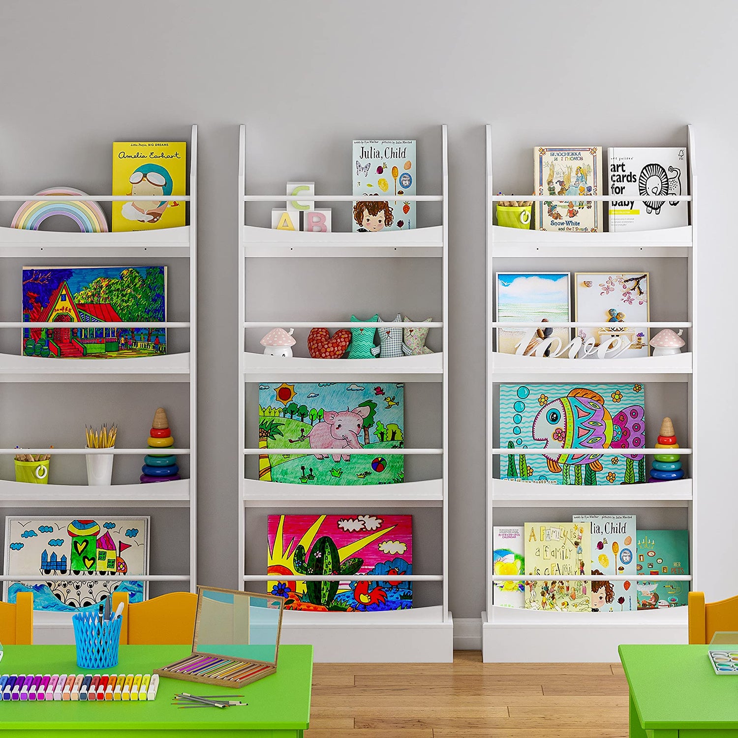 - Sturdy and durable bookshelf: The front facing bookshelf is made of high quality artificial wood, the surface is smooth and wear-resistant, easy to clean and will not cause any harm to the children