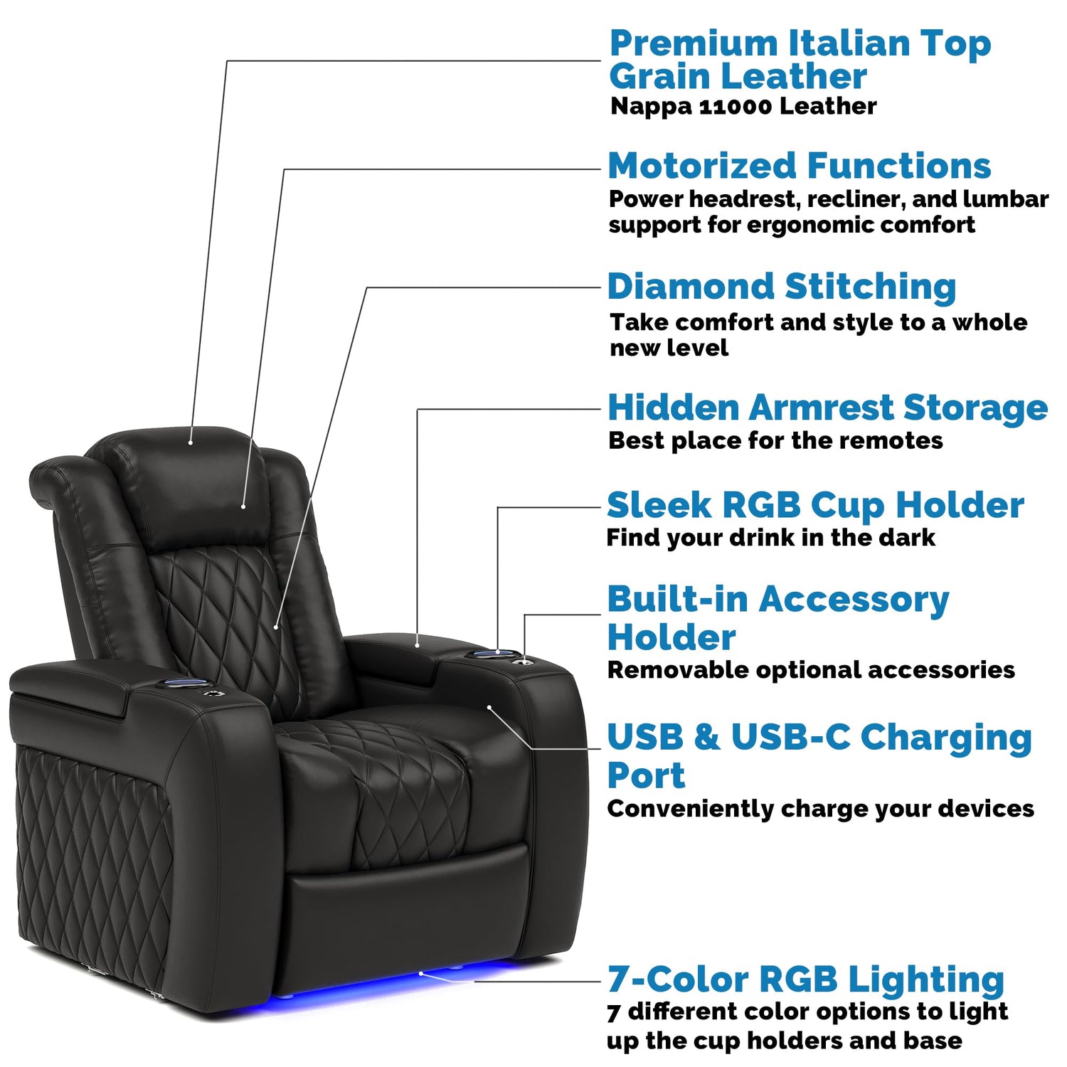 - ✔ Dynamic RGB LED Lighting – 7 vibrant colors enhance ambiance, while illuminated cupholders make drinks easy to find in the dark.