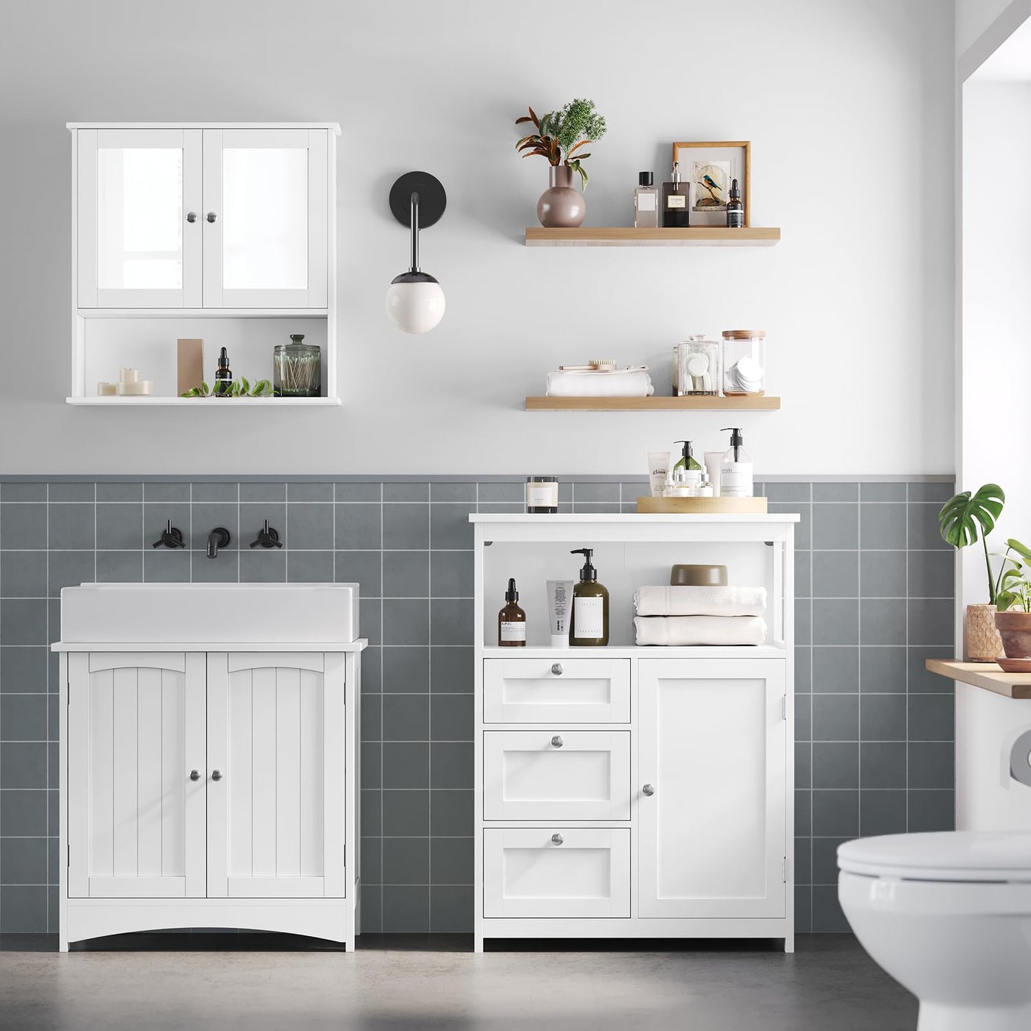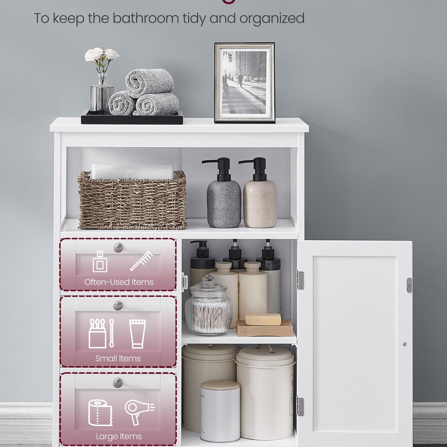 - Elegant Look: The sleek white color combined with the simple lines gives this floor cabinet a fine modern look that fits with your home decor. Whether it's in the bathroom, living room, or entryway, it'll always make a striking impression