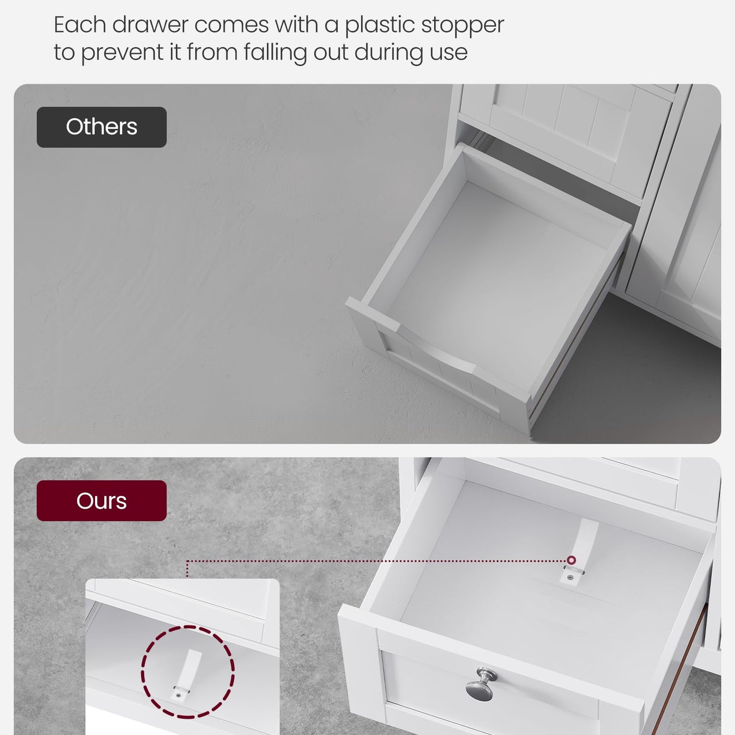 - Secured Drawers: The 3 drawers of this freestanding storage unit are equipped with plastic tabs that prevent them from falling out when opened