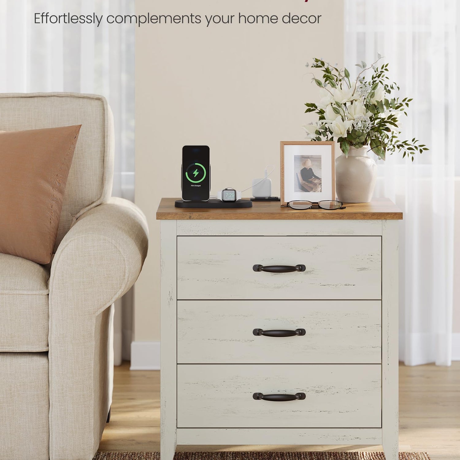 VASAGLE LIRY Collection - Farmhouse Nightstand with Charging Station, Bedside Table, Side End Table with 3 Drawers, for Bedroom, Rustic White and Honey Brown ULET679W01