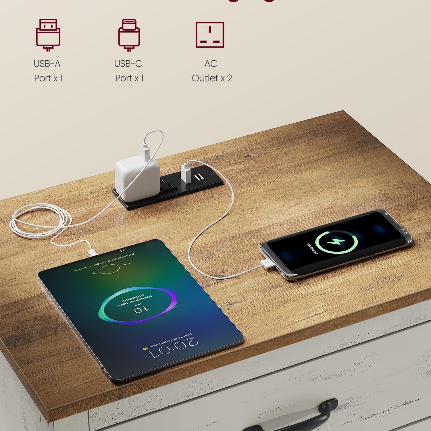- Convenient Charging Station: Stay away from low battery alerts with our nightstand's built-in charging station. It includes 1 USB-A port, 1 USB-C port, and 2 AC outlets, providing a handy power source for your devices