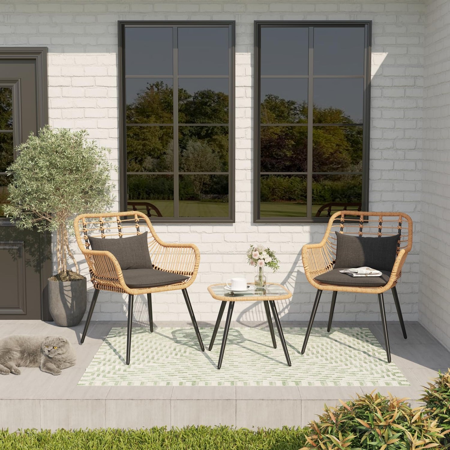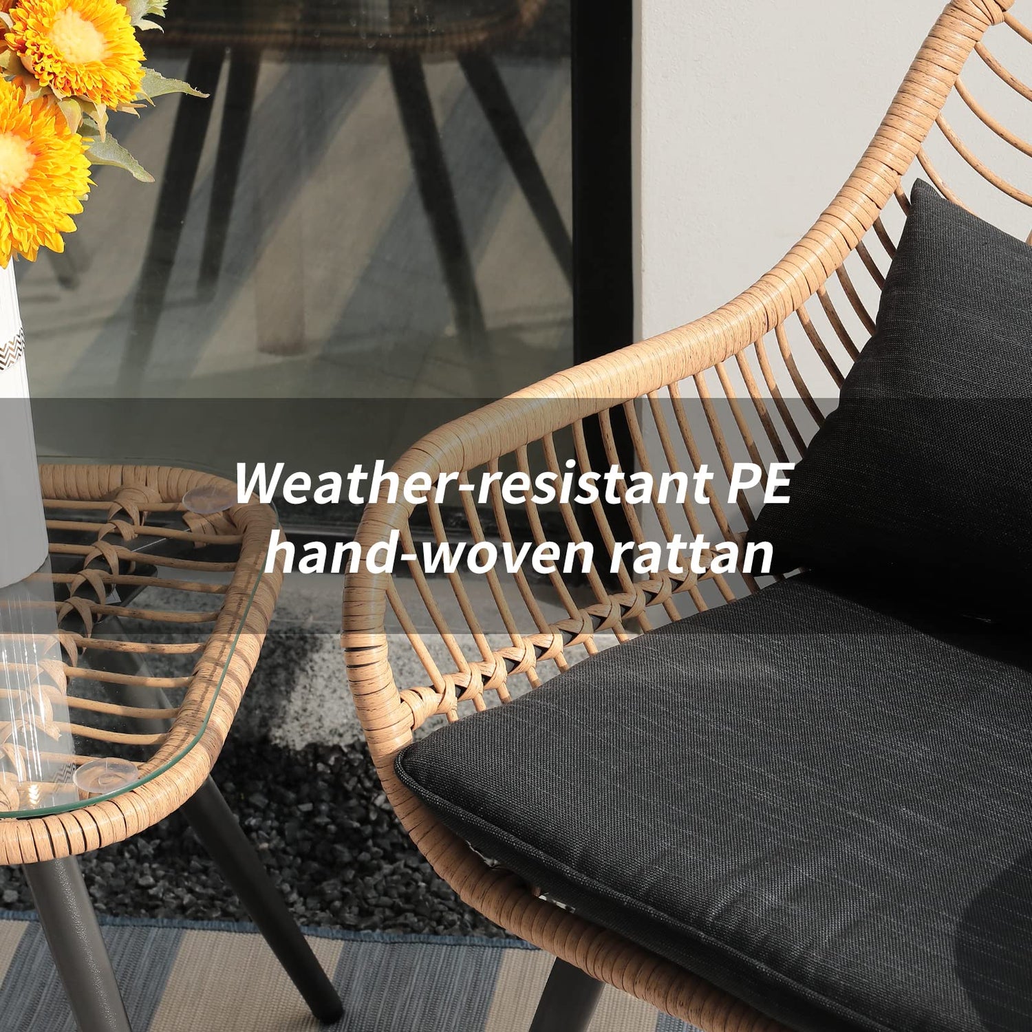 Verano Garden 3 Piece Patio Bistro Set, Outdoor Wicker Conversation Chair Sets Balcony Furniture,Coffee Table with Glass Top, Cushions & Lumbar Pillows for Porch, Backyard, Deck, Poolside