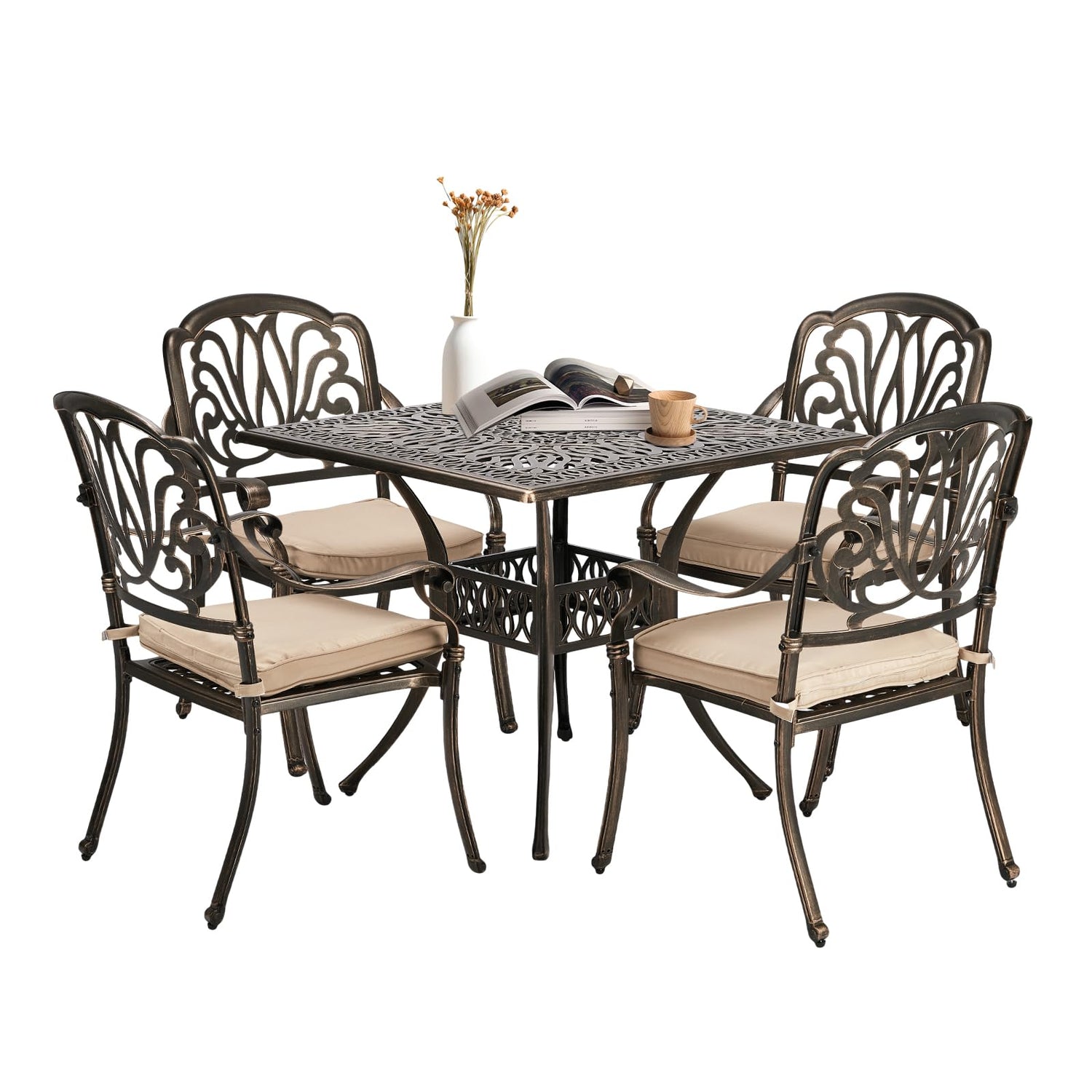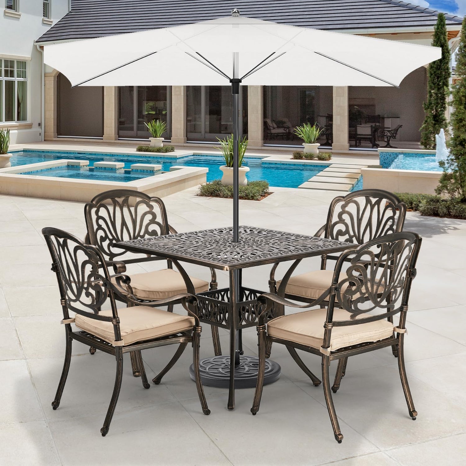 VINGLI 5-Piece Outdoor Patio Dining Set, Cast Aluminum All-Weather Outdoor Table and Chairs w/Cushion, Outdoor Furniture Set w/Umbrella Hole for Backyard Deck Poolside (Square, Elizabeth Back)