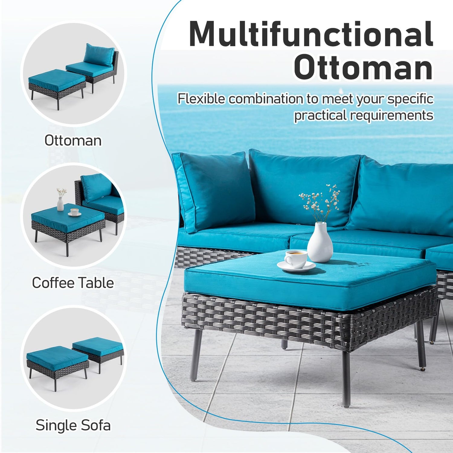 - MULTIFUNCTIONAL DESIGN: The matching footstool has 2-in-1 functions, which can be converted into a coffee table according to your outdoor living needs. Bring you a unique user experience