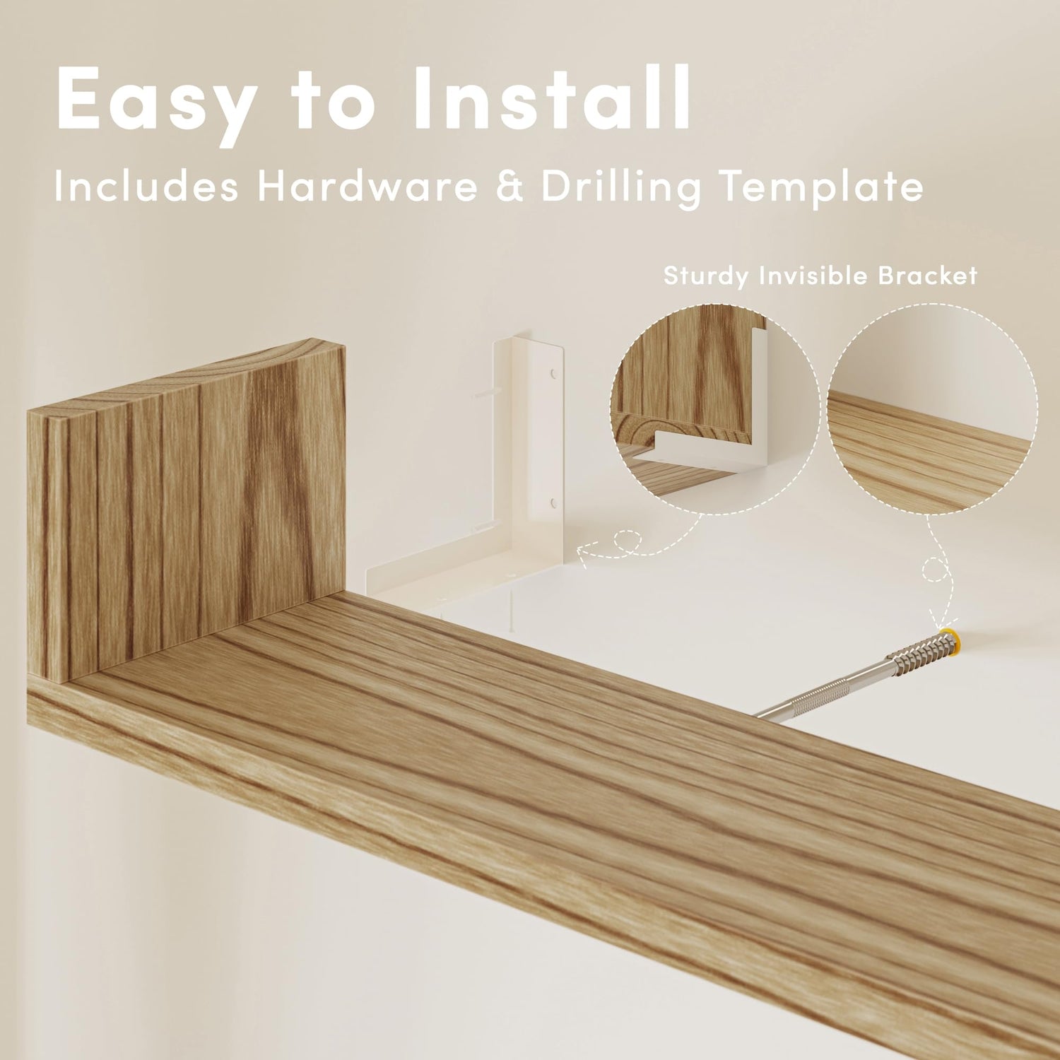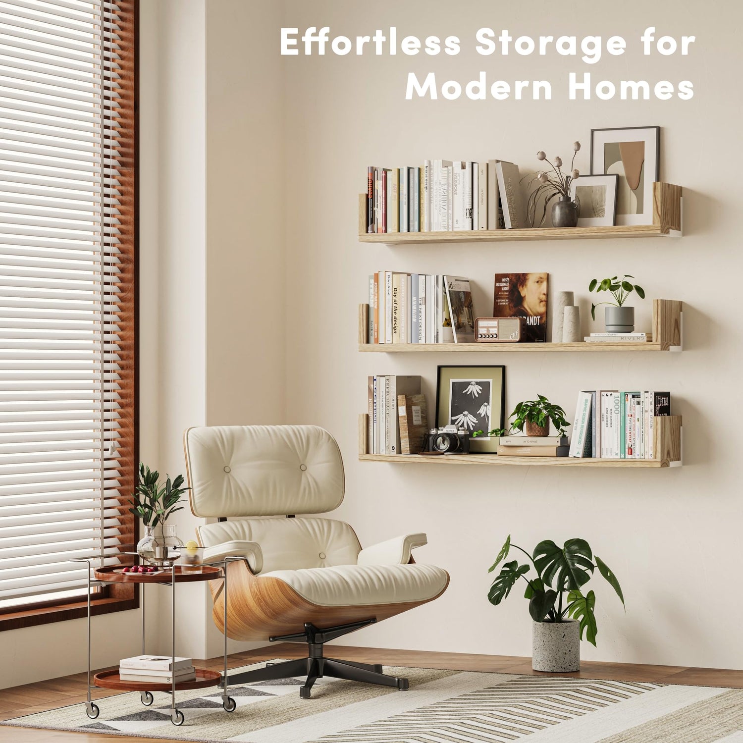Details: Upgrade your walls with this set of three 36-inch U-shaped floating shelves. The long, deep profile gives you real room for oversized cookbooks, framed photos, pantry jars, and décor, while the raised sides keep items upright and tidy. Crafted from wood with a smooth finish, these large wall bookshelves deliver a clean, modern look that works in the kitchen, bedroom, living room, or home office. Hang them together for a statement wall or split them across rooms to add practical vertical storage wherever you need it. A simple wall-mount design creates a true “floating” effect and keeps floors clear for easy cleaning.