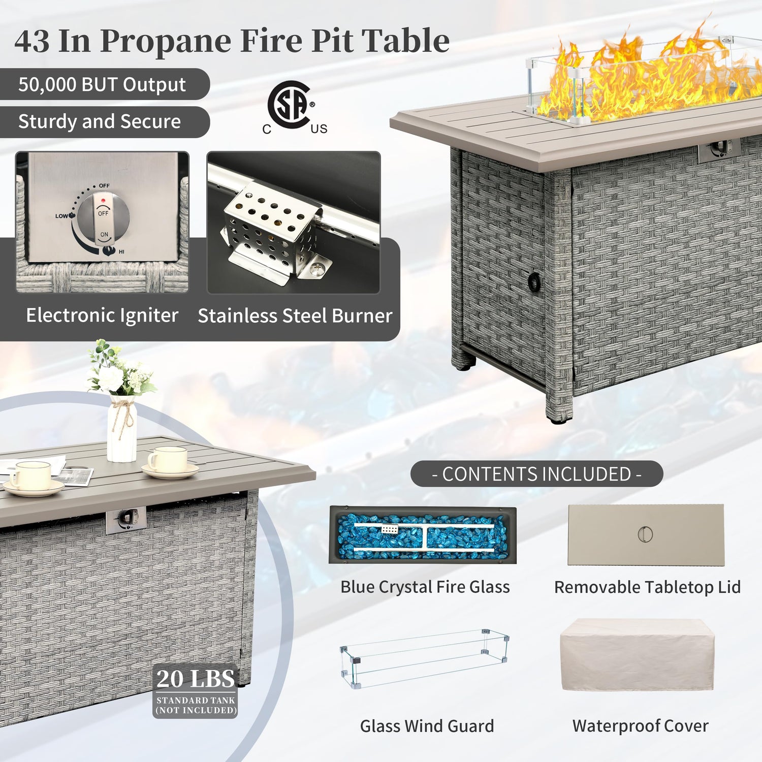 • 50,000 BTU Output: This patio fire pit table comes with a removable lid and can be used as a dinning table. Works with a standard 20 lb propane tank(not include). Includes glass wind guard and fire glass that is clean enough to make flames more fun