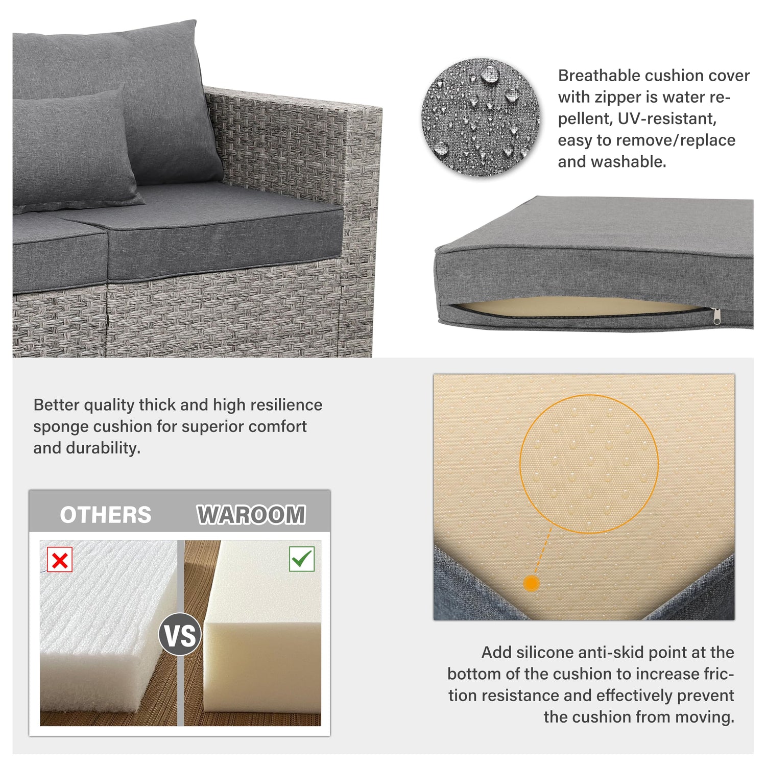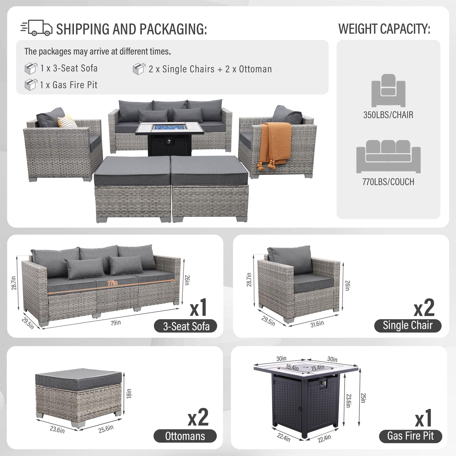 WAROOM Patio Furniture Set 6 Piece Outdoor Patio Set Grey Wicker Balcony Furniture Conversation Sets PE Rattan Couch Sofa with Fire Pit Table, Grey Cushion