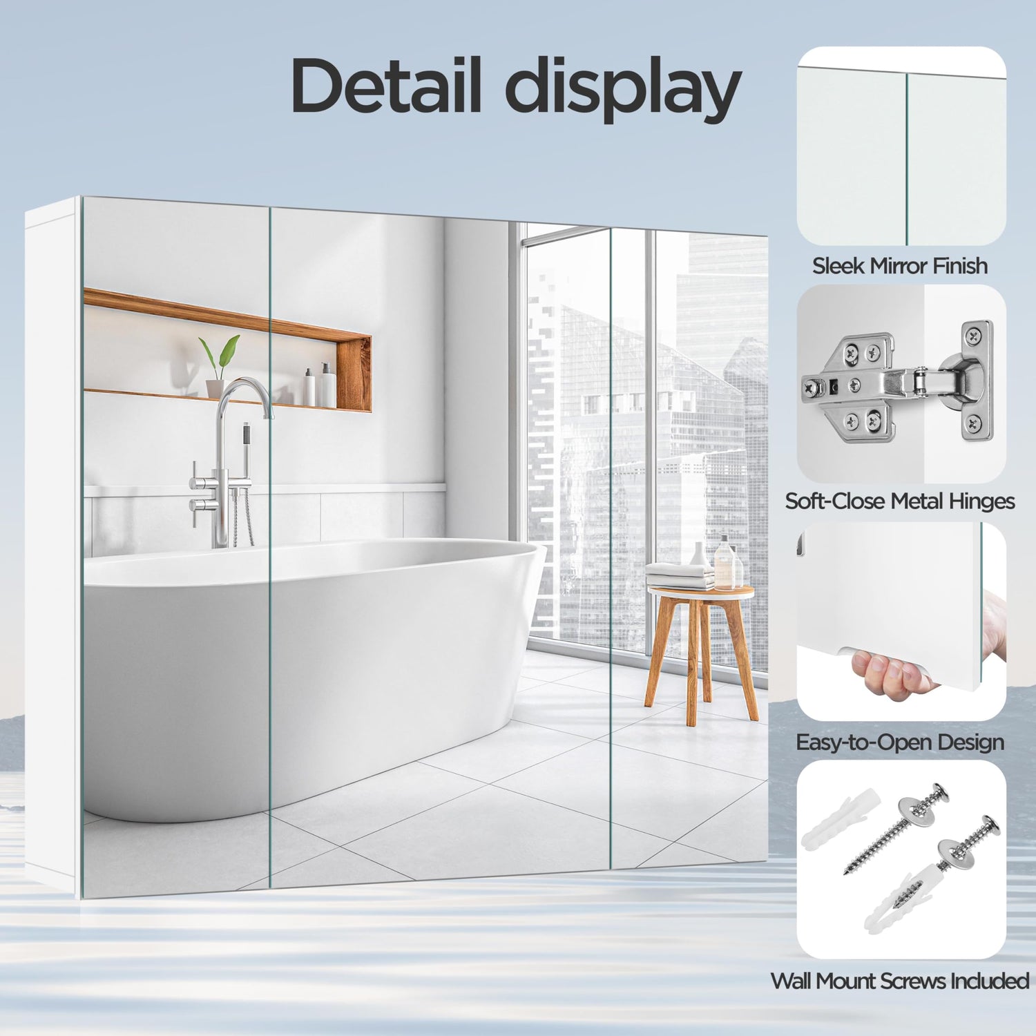 - Sleek Frameless Mirror Doors: This frameless mirror cabinet features three mirrored doors, offering a clean look with full-surface reflection for makeup or grooming. The enclosed cabinet stays dust-free, while smooth door edges ensure easy daily use