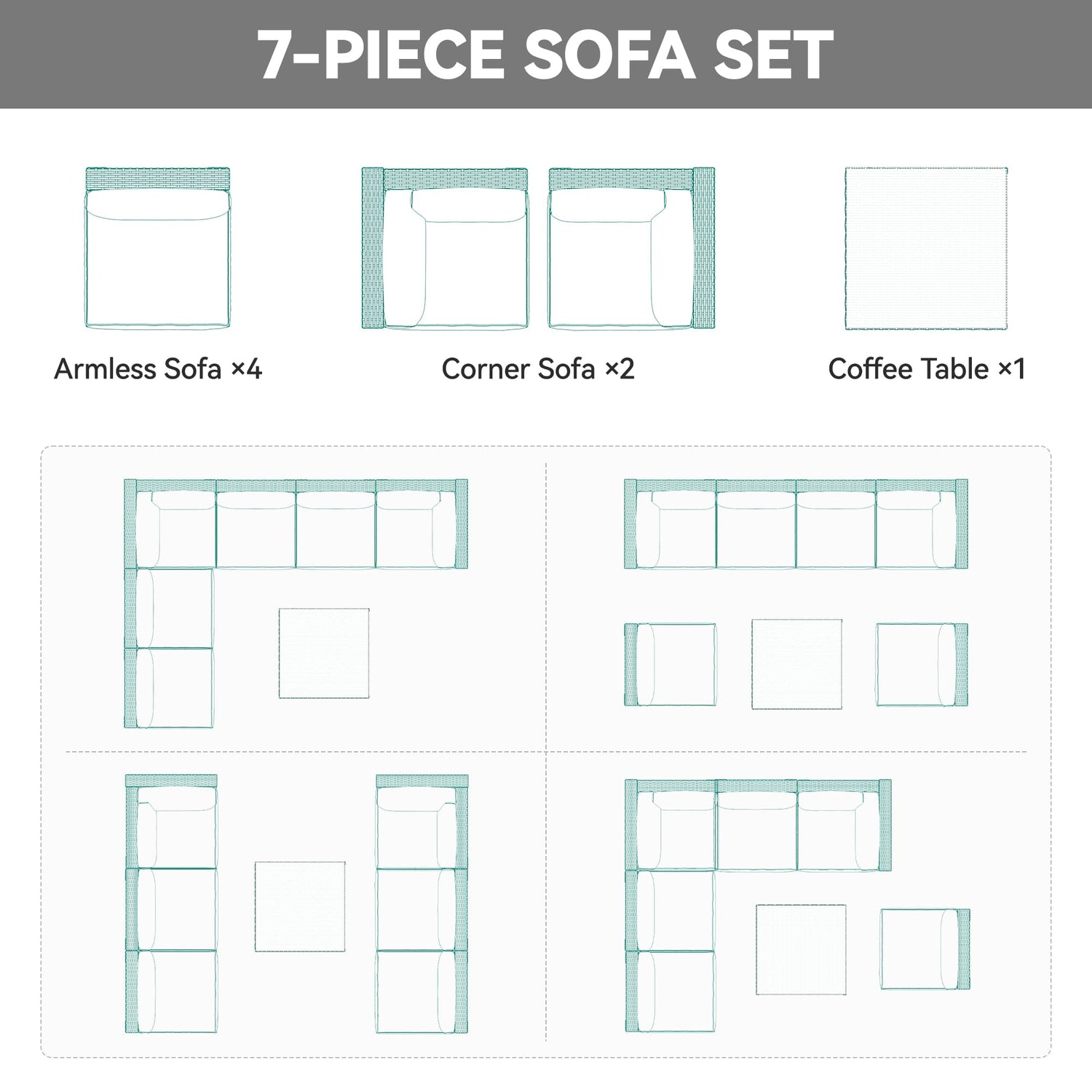 - INFINITE COMBINATION: Configure this 7-piece outdoor furniture set including 2 identical corner sofas, 4 armless sofas and 1 table at will to elevate your patio, pool, garden, courtyard, backyard, porch, or balcony, savoring outdoor leisure with your friends or family