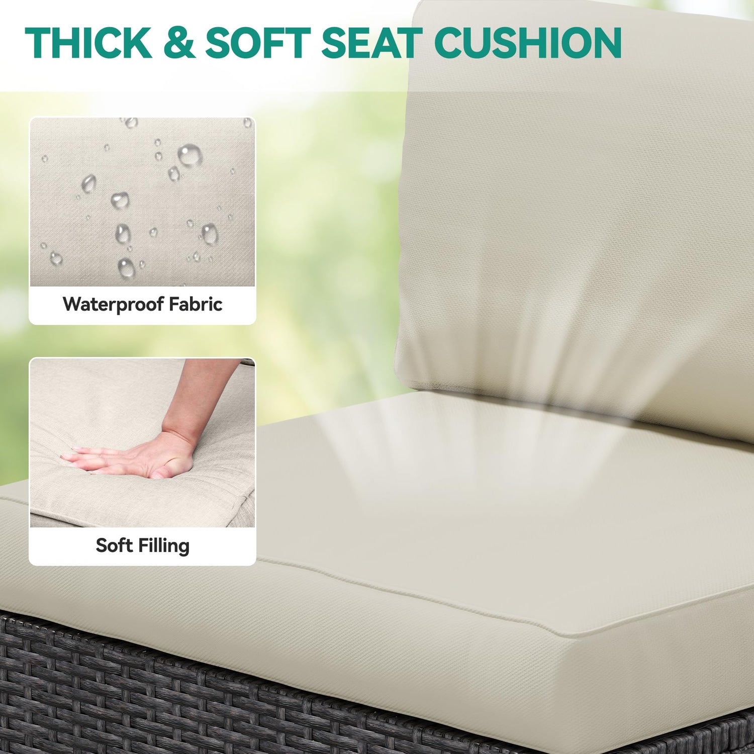 - UNWIND IN STYLE: Thickly sponge-filled seat and back cushions offer good resilience for carefree lounging; Horn buckles fix cushions from slipping off; Neutral-hue beige staple fiber cushions harmonize with black rattan to grant this patio furniture set with modern sleekness