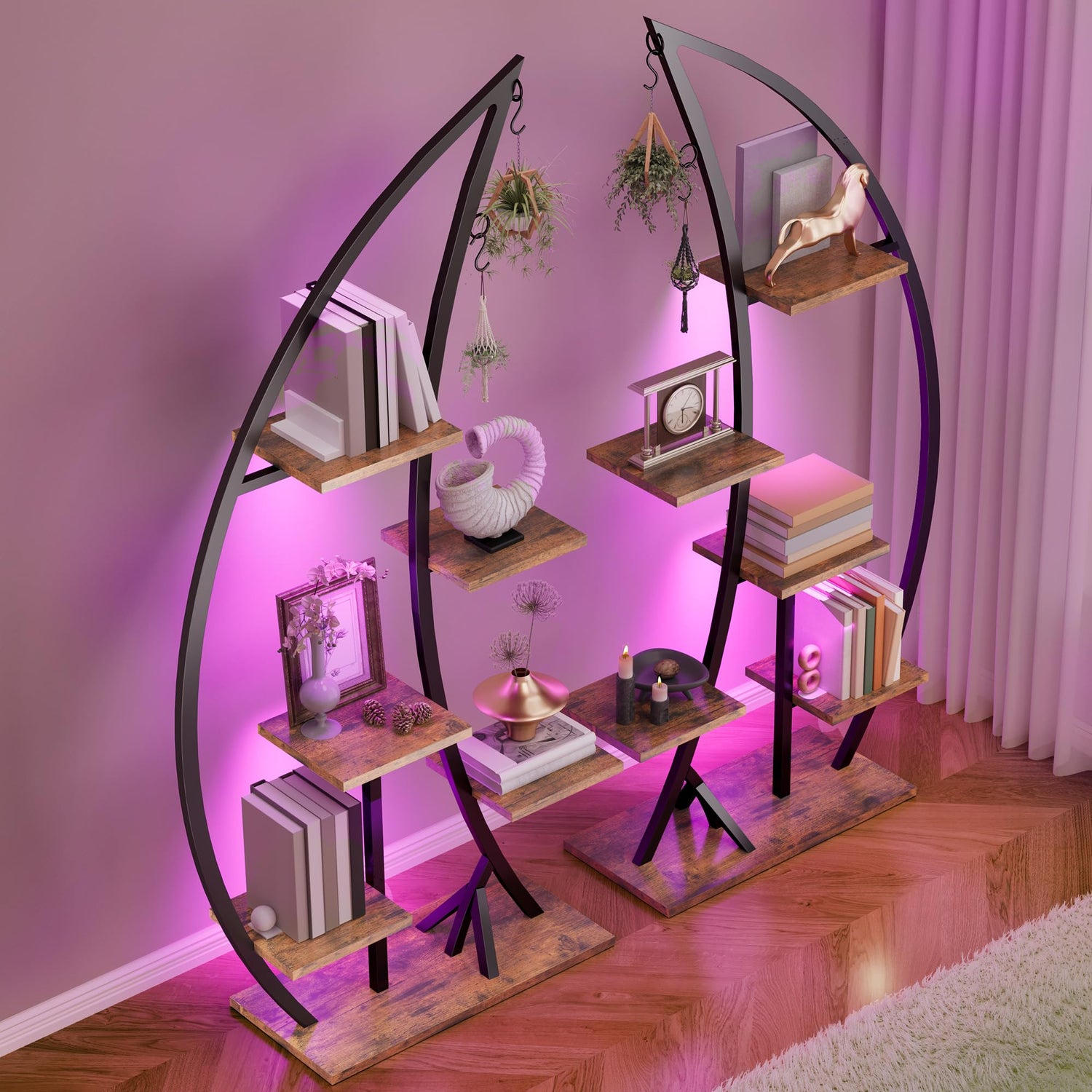 YITAHOME Tall Bookshelf with LED Light, Artistically Designed Crescent-Shaped Bookshelf with 10-Tier Shelves, Corner Bookcase Open Display Rack for Home Office, Bedroom