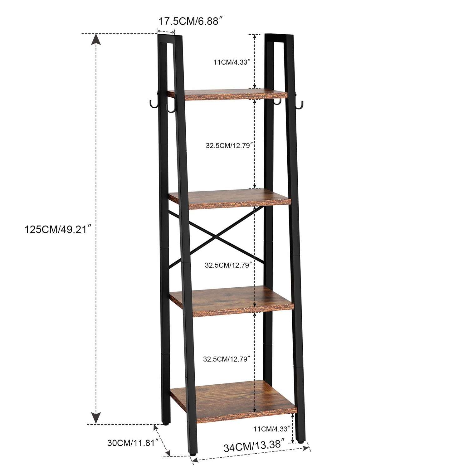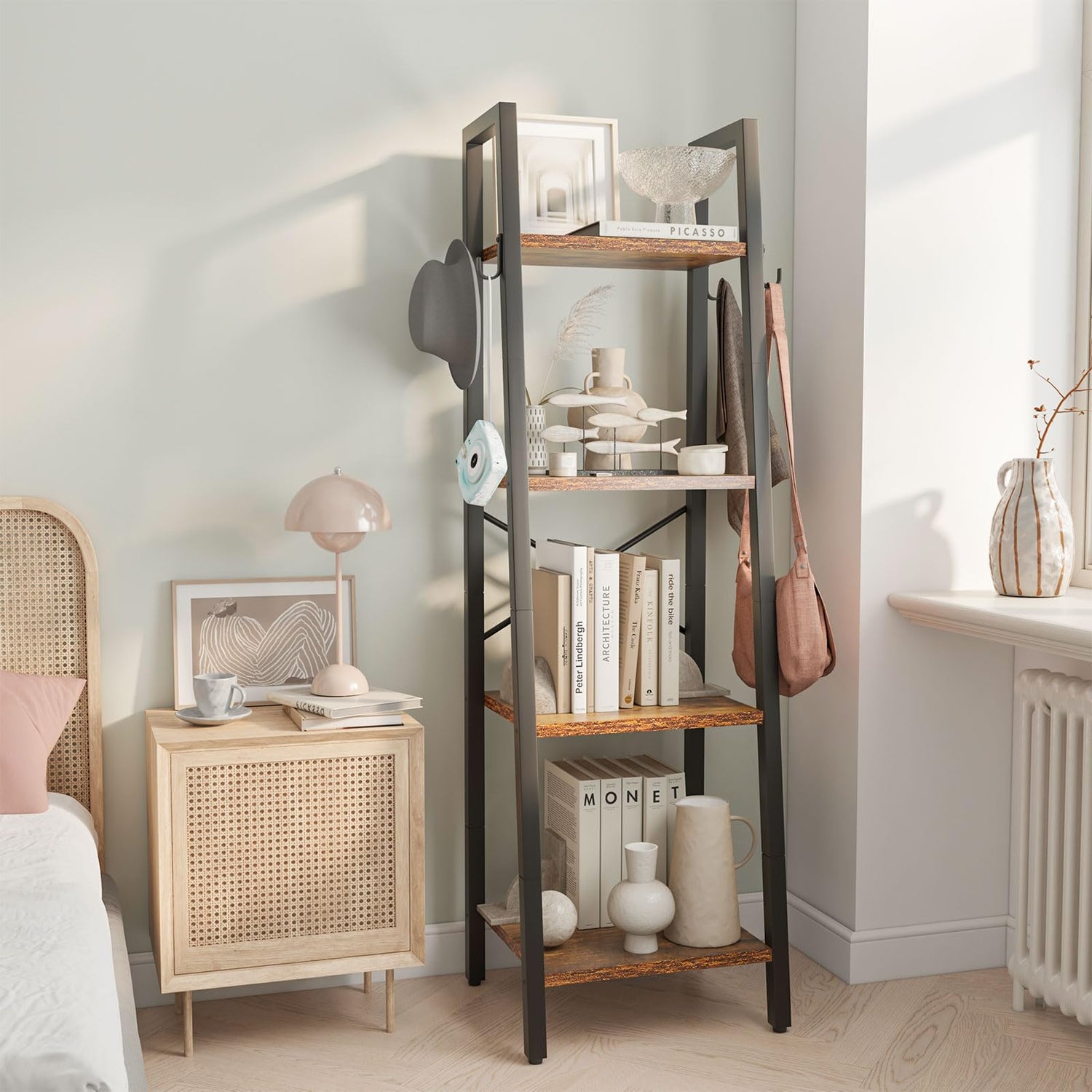 YMYNY 4 Tiers Ladder Bookcase, Industrial Narrow Bookshelf, Open Display Rack with 4 S Hooks, Metal Storage Shelves for Bedroom, Home Office, Living Room, Rustic Brown, 49.2H*13.4L*11.8W, UHBC024H
