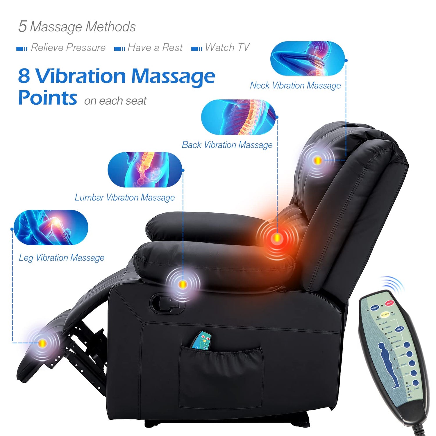 - Massage & Heating--This reclining loveseat has 5 adjustable vibration massage modes as well as 4 massage positions per seat. You can set your timer preferences and the heating function also promotes your blood circulation during the massage.