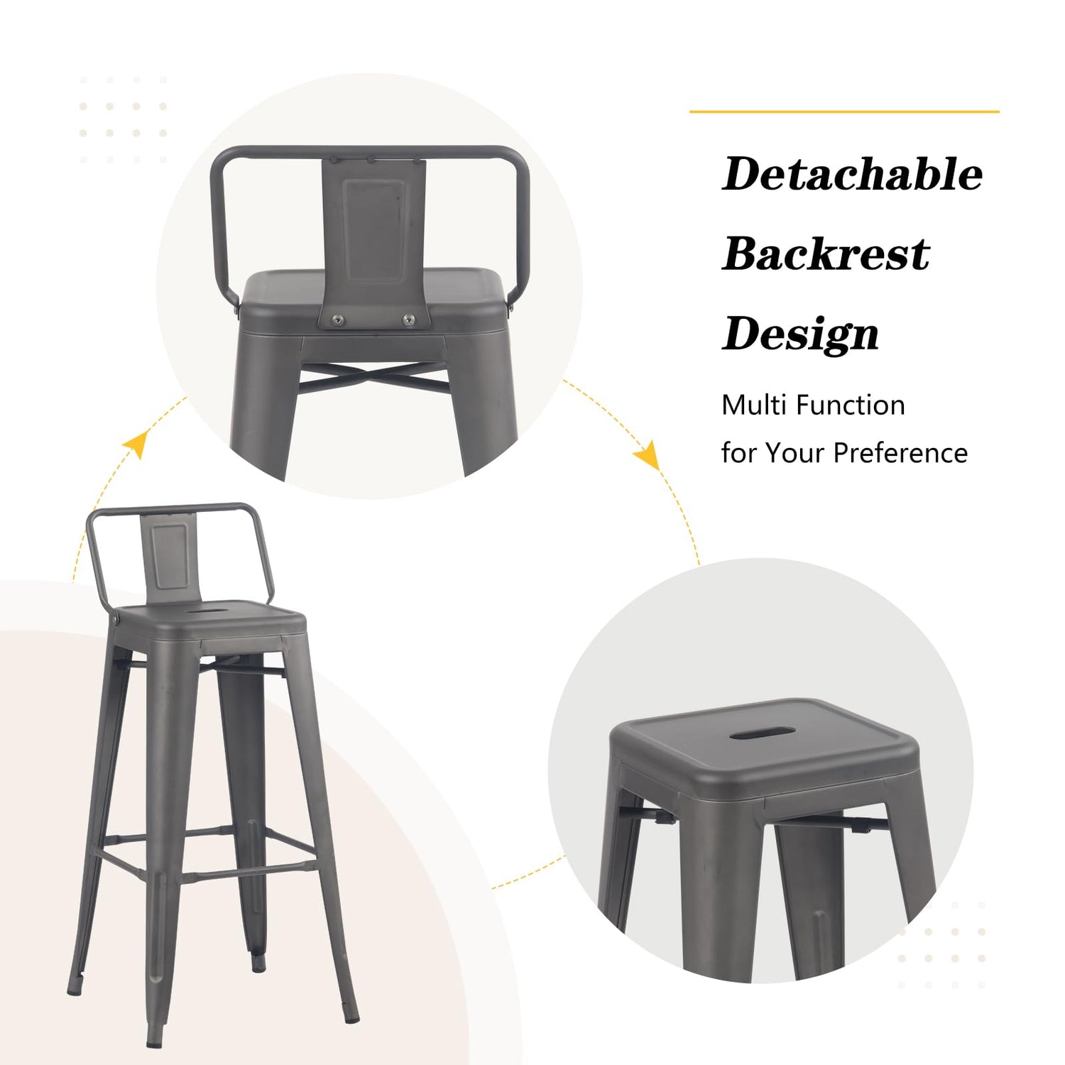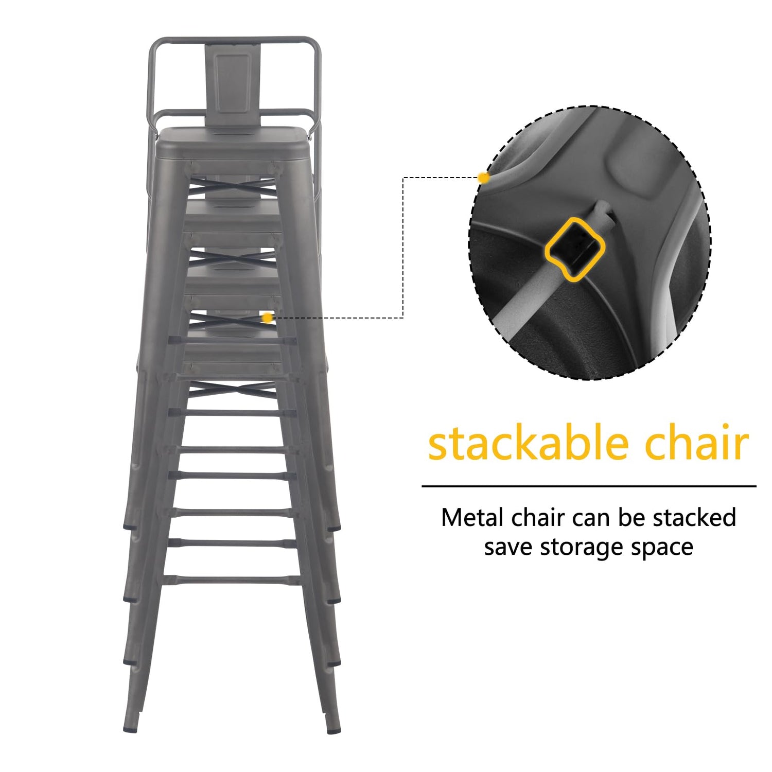 - 🌶️【Stackable for space saving】: The metal barstool has a removable back for easy stacking, making the storage less of a hassle. No more chaos, only tidiness and fresh remain. And plastic pads on the bottom prevent scratches on the chair surface when stacking.