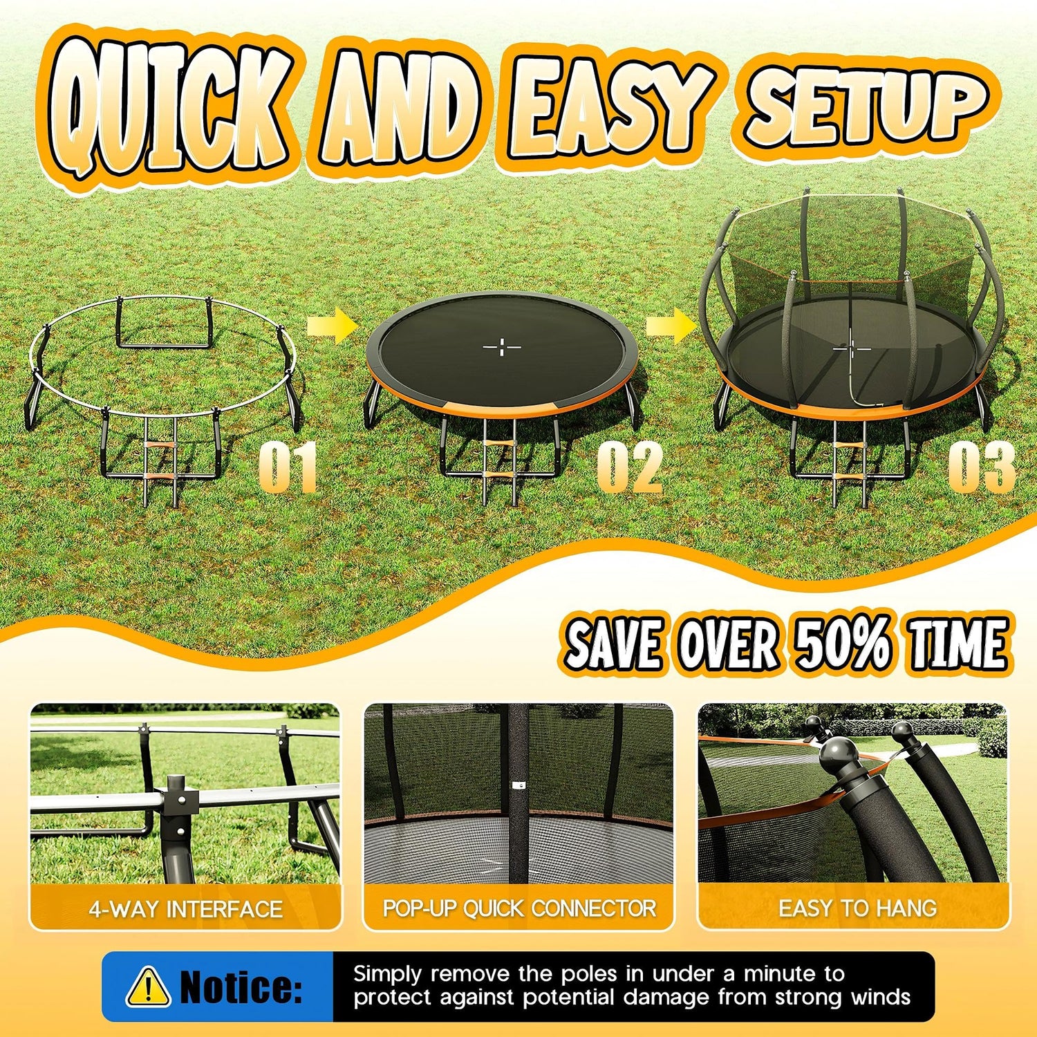 - Quick and Easy Setup – No Time Wasted: The kids trampoline equipped with patented pop-up quick connector, 4-way interface and easy-to-follow instructions, you can slash installation time by 50% and won't keep children waiting for long! Remove poles in seconds to prevent against potential damage from strong winds.