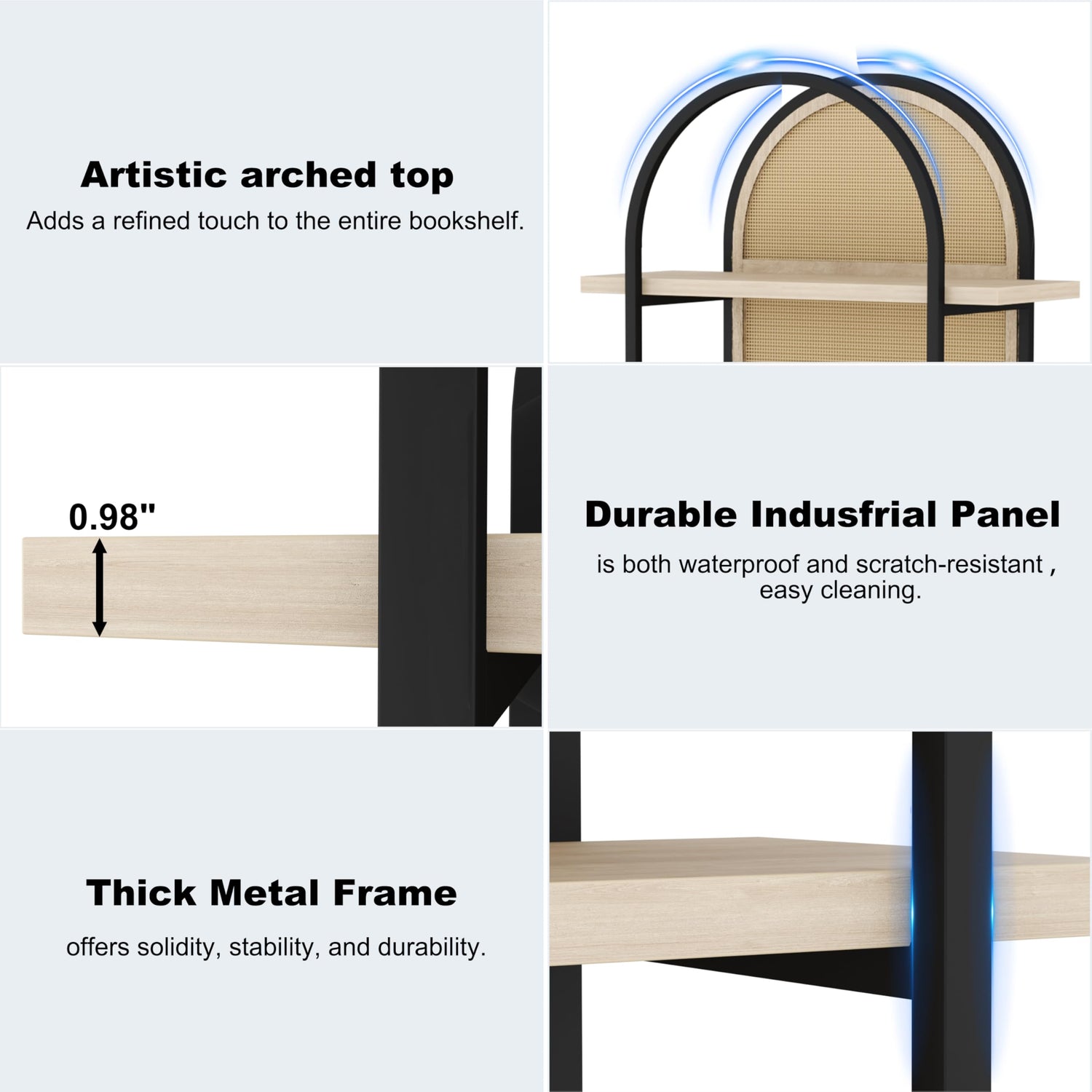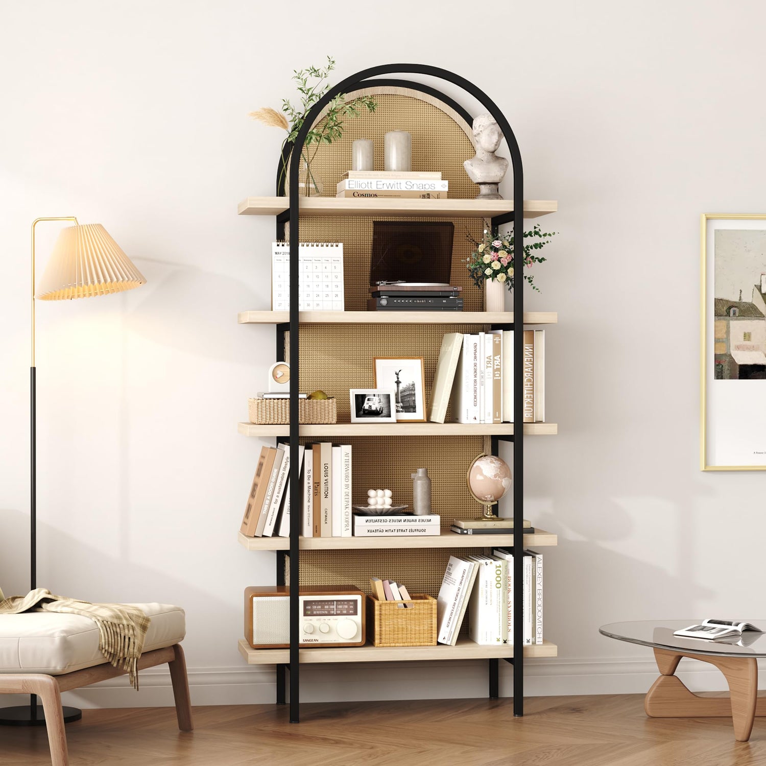 Yusong Bookshelf Rattan 5 Tier Arched Bookcase, 74" Tall Industrial Open Book Shelves for Living Room, Modern Freestanding Display Shelving Boho Storage Rack with Metal Frame for Office, Brown