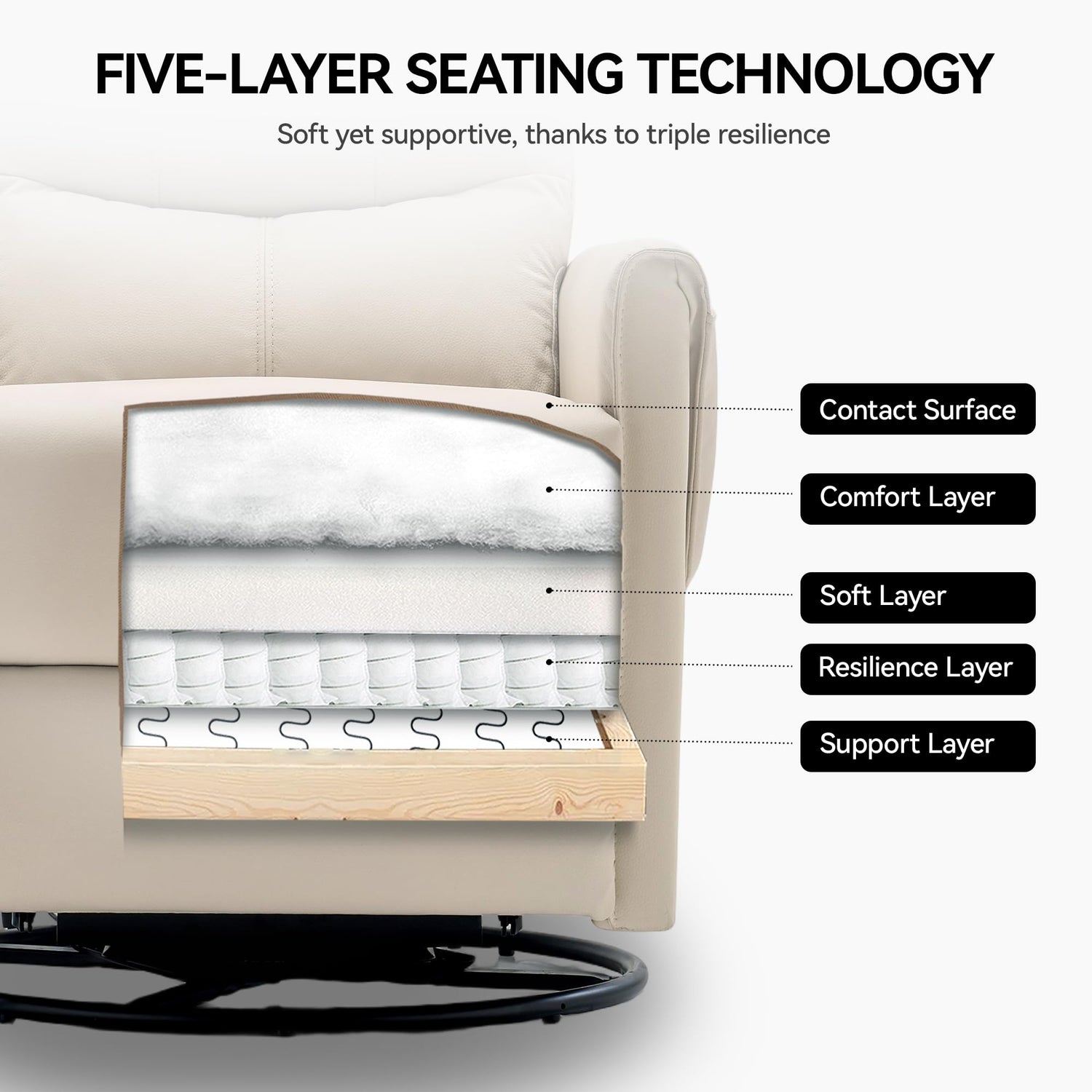 - High-Resilience Comfort Cushion:The chair recliner contact layer is made of top-grain leather. The comfort layer of the rocking recliner uses silk floss and high-density eco-friendly foam; the resilience layer of the rocker recliner chair uses high-density fire-resistant springs; The support layer of the recliner chair swivel is made of 0.82% carbon steel springs, providing enhanced rebound performance and doubling the comfort.