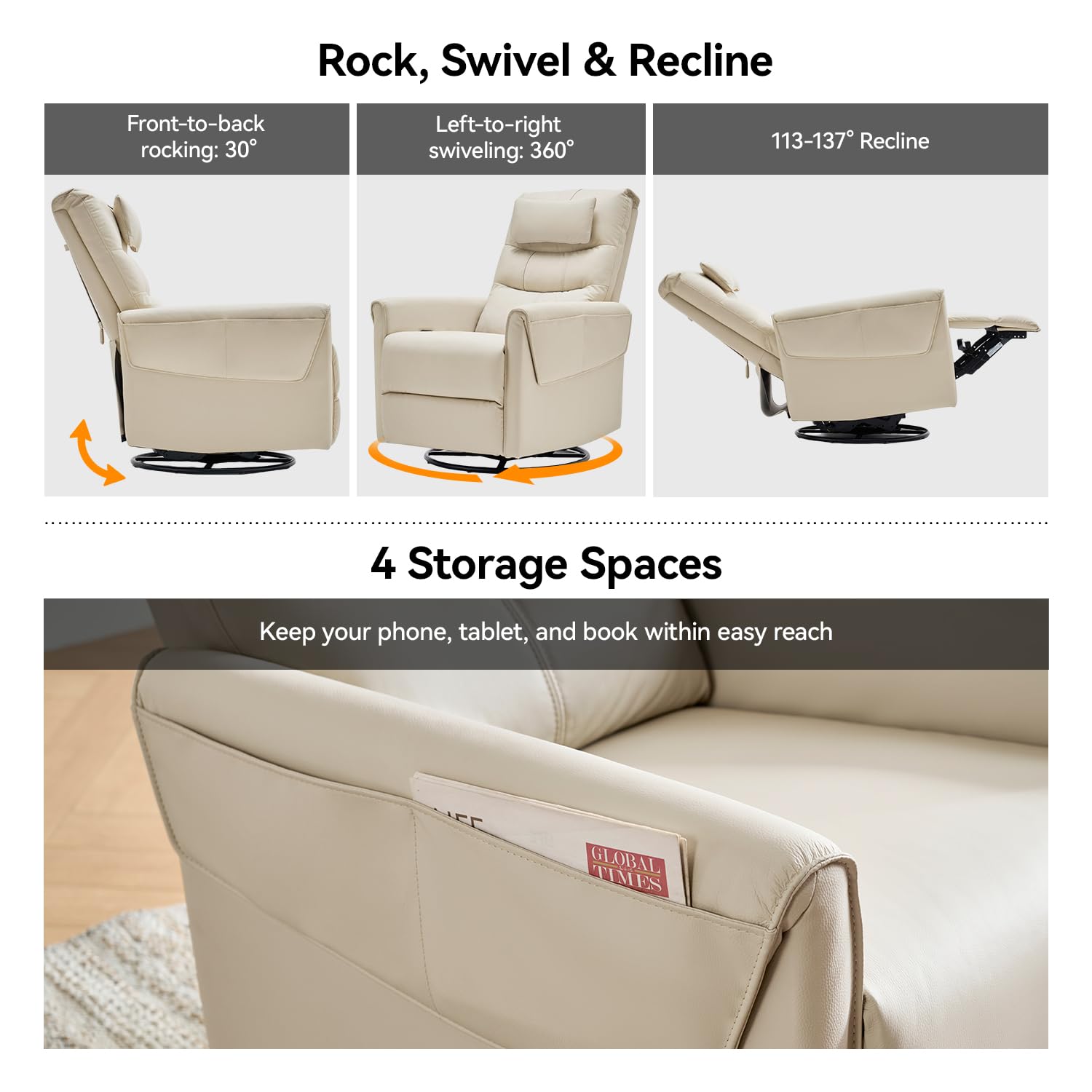 - Rocker Swivel Recliner: The nursery rocking chairs is capable of rocking 30° back and forth and swiveling 360°, with a reclining angle ranging from 106° to 132°. The recliner chair clearance seat (21.65 inches deep and 19.68 inches wide) ensures plenty of room to sit comfortably.