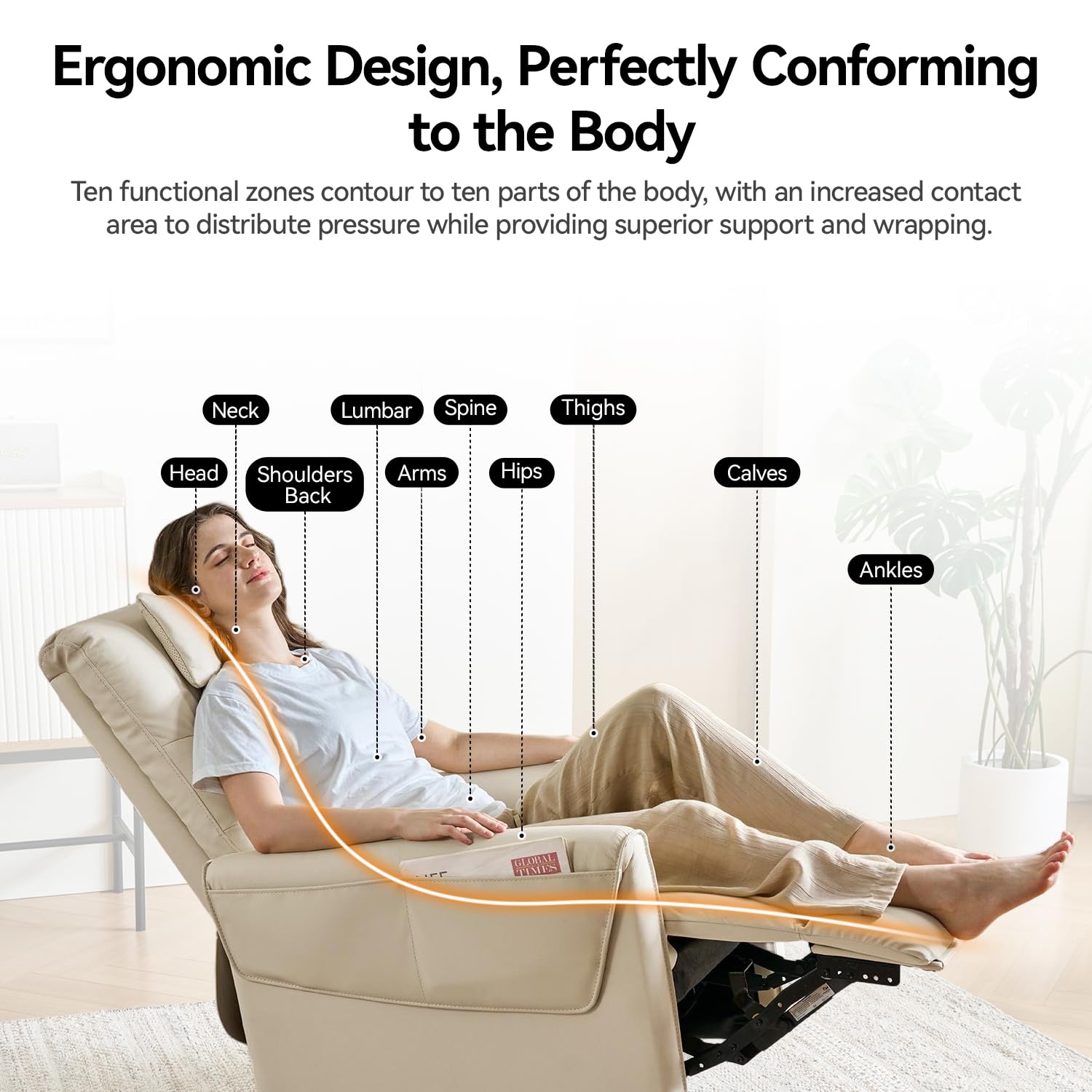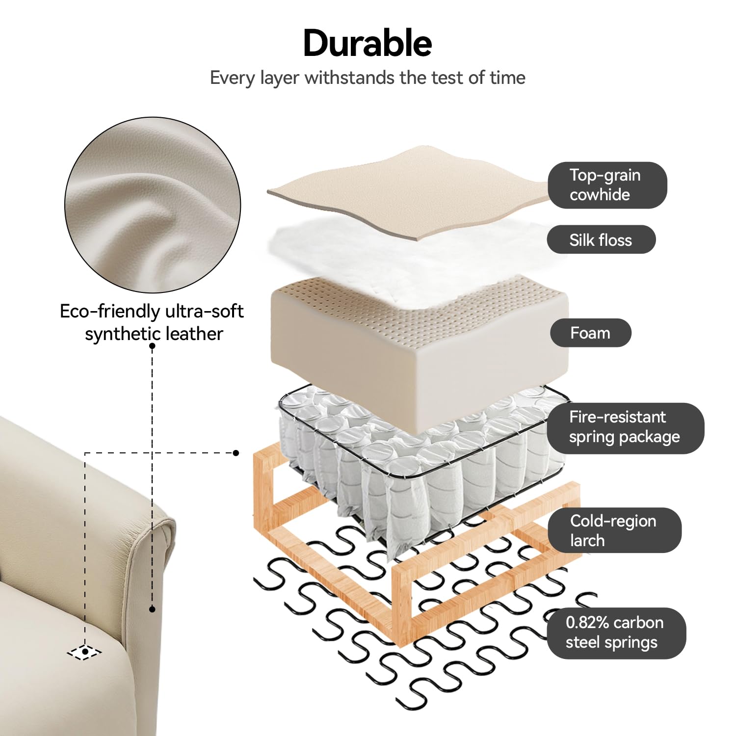 - High-Resilience Comfort Cushion:The sillones reclinables para adultos contact layer is made of top-grain leather; the comfort layer of the recliners uses silk floss and high-density eco-friendly foam. The resilience layer of the rocker recliner uses high-density fire-resistant springs. The support layer of the reclining chair is made of 0.82% carbon steel springs, providing enhanced rebound performance and doubling the comfort.