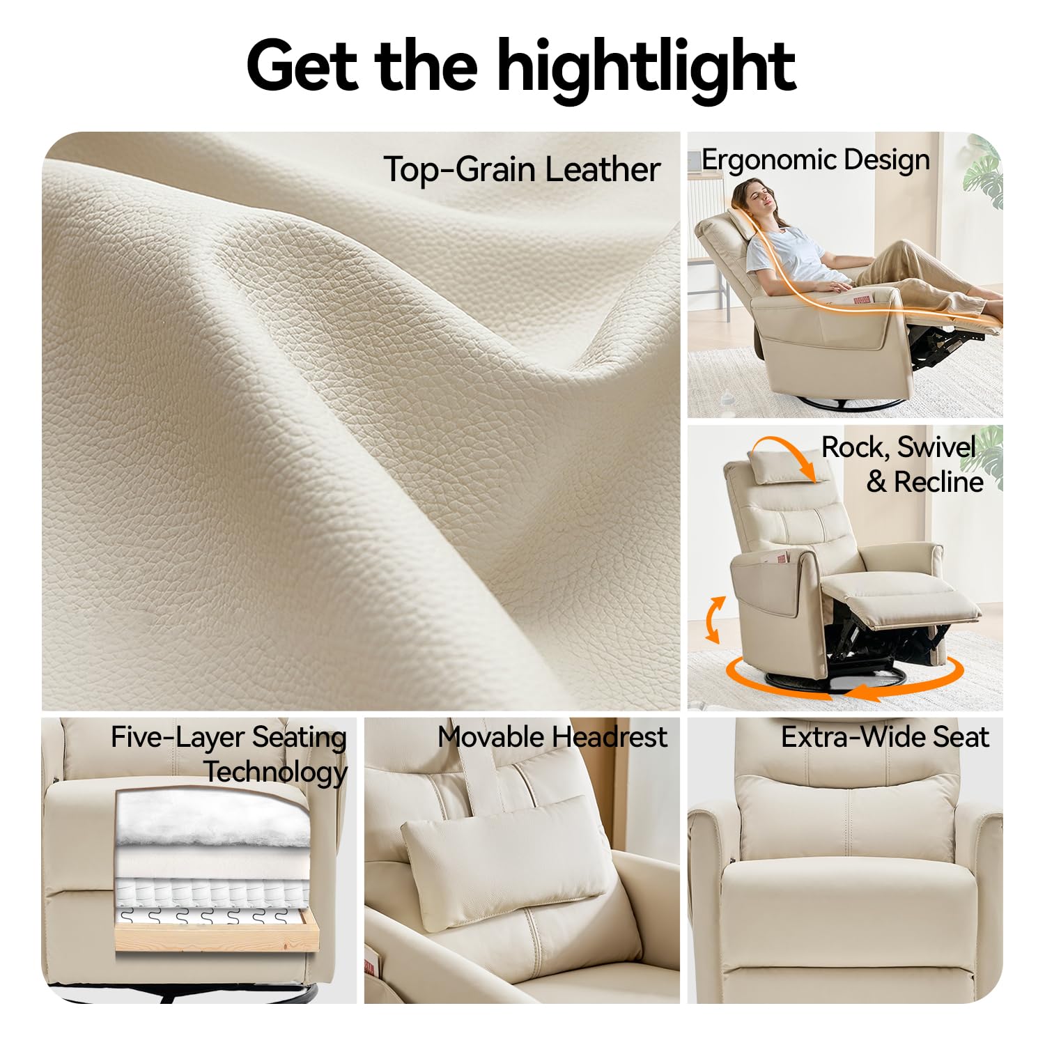 AIRSKY Leather Recliner Chair, Top Grain Leather, Italian Water-Washing Process, Movable Headrest,Swivel Rocker Recliner, Nursery Rocking Chairs,Wall Hugger Recliners, Living Room Chair, Beige, R3