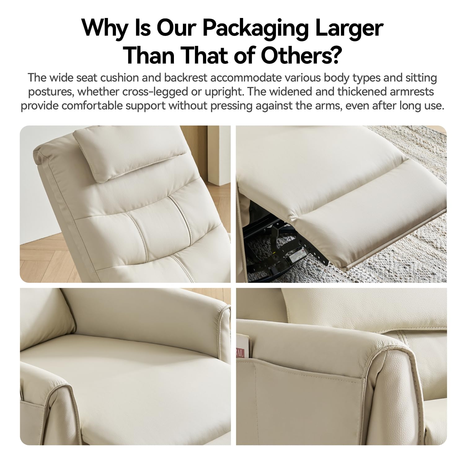 - Three Safety Certifications: The rocking recliner is made from eco-friendly and healthy materials, including eco-friendly ultra-soft synthetic leather, formaldehyde-free foam, and cold-region larch. The foam of glider recliner has passed OEKO-TEX and CertiPUR-US certifications, while the genuine leather of recliner chairs for adults is SGS-certified. In contrast, inferior functional recliner chair swivel often use powder-mixed foam to enhance softness and low-quality synthetic wood for the frame, which poses potential safety risks despite similar appearances.