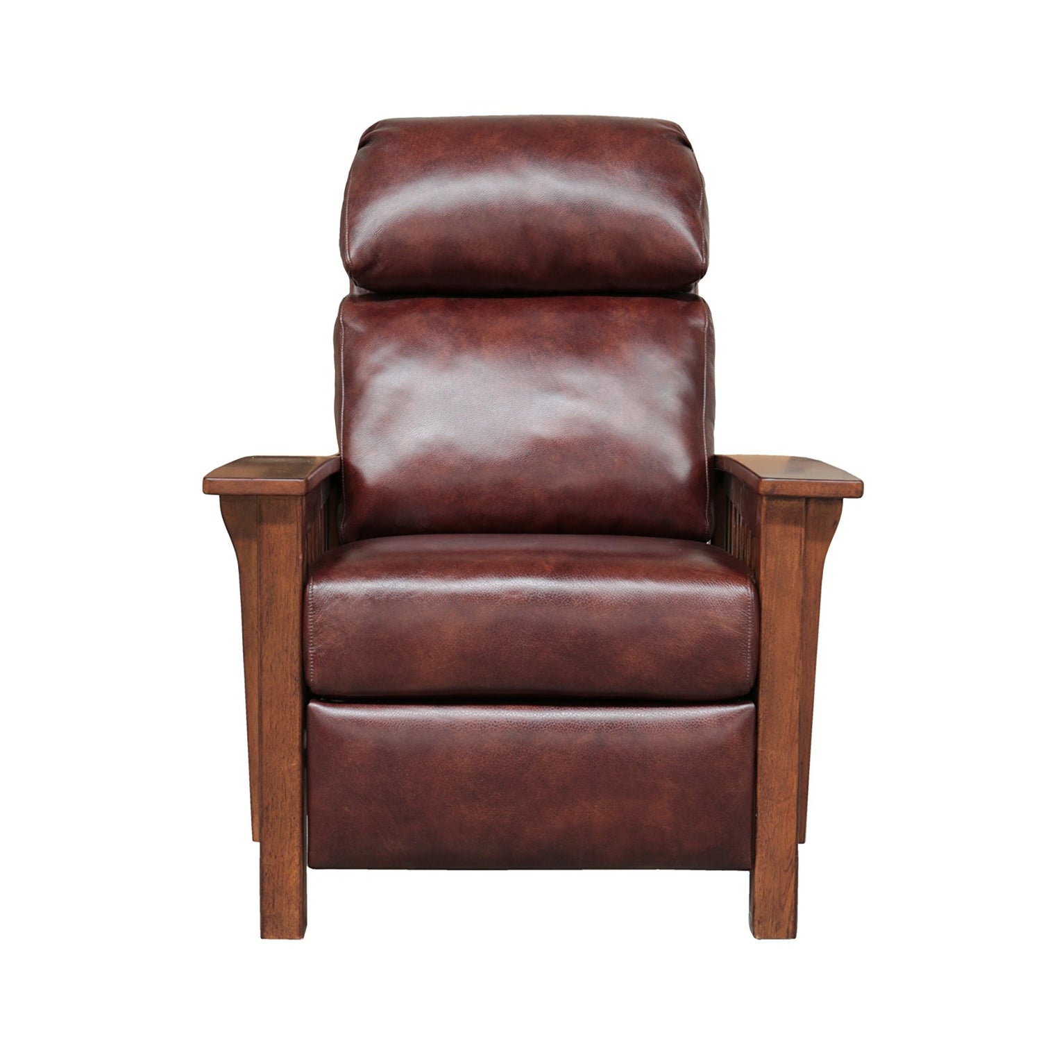 Details: Barcalounger Mission 7-3323 All Leather Push Back Manual Recliner Chair - New Craftsman 7-4411 Model from the Barcalounger Woodland Reserve Collection- Characteristic of Art and Crafts period, the Mission recliner offers classic craftsman styling and boasts luxurious comfort with semi attached pillow back. New Version of the Craftsman 7-4411 Model from the Woodland Reserve Collection Classic reclining lounge chair. Hand carved Mahogany Wood Finish. Leggett & Platt mechanisms are ACTIVATED not operated. The Recliner only requires 2.5 lbs of pressure to release and push back. Mechanisms feature delrin bushings wherever metal meets metal to provides seamless motion, longevity and never squeaks. Mechanisms are attached to the frame with bolts and t-nuts to prevents screw "back-out" to increase stability and durability. Genuine All Leather Recliner. Overall Dimensions: 32.7"Wide X 37.5"Deep X 42"High Seat Dimensions: 22"Wide X 19"Deep X 21"High Arm Height: 24.4" Wall Proximity: Needs to be at least 16.2" from the Wall to recline. Chair Weight: 100 lbs. Gross weight (chair in box) 115 lbs, Maximum Load Weight 285 lbs. Barcalounger Factory One Year Warranty Shipping Box Dimensions 34"Wide x 30"Deep x 34"High - 20 Cubic Feet