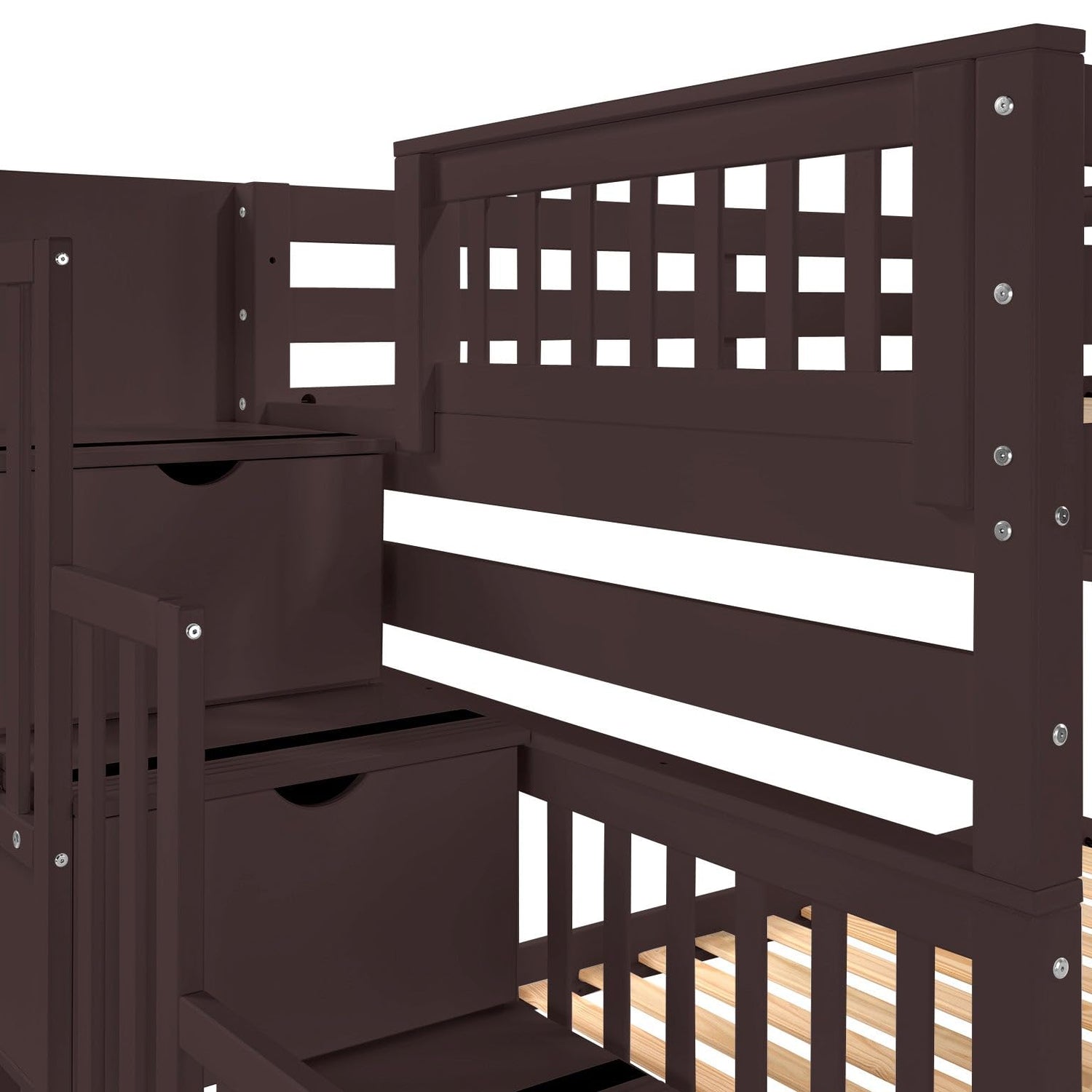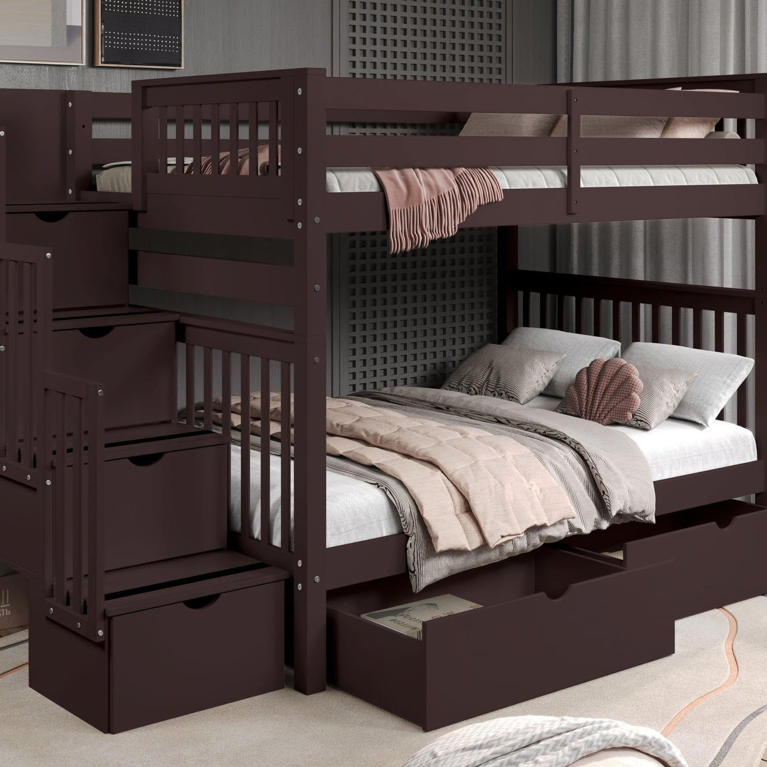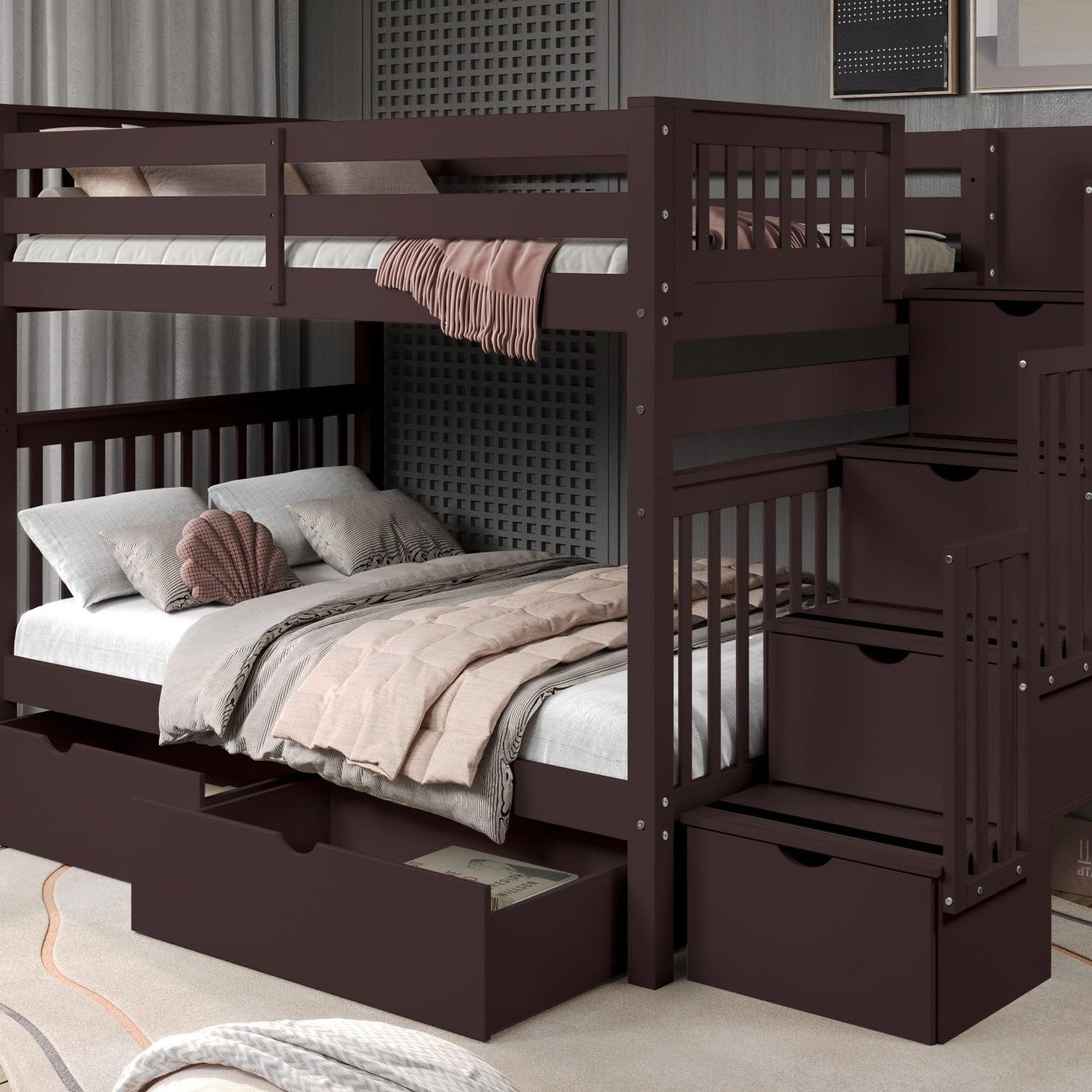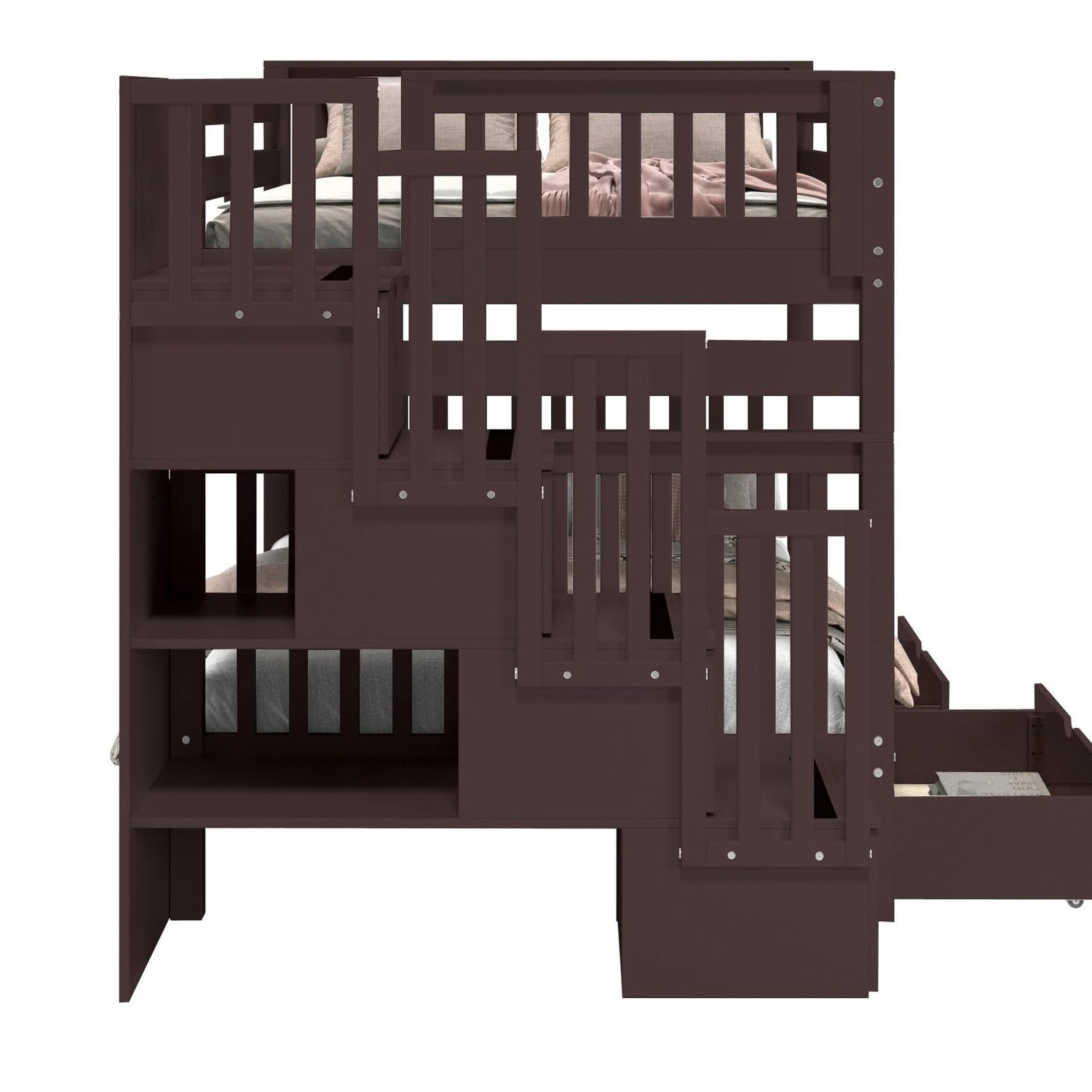 • Built-in 4 Step Stairway instead of a ladder for easy access to the top bunk with 4 Drawers built into the Stairway and 2 Under Bed Drawers. Position the stairs on the right or left of the bed.