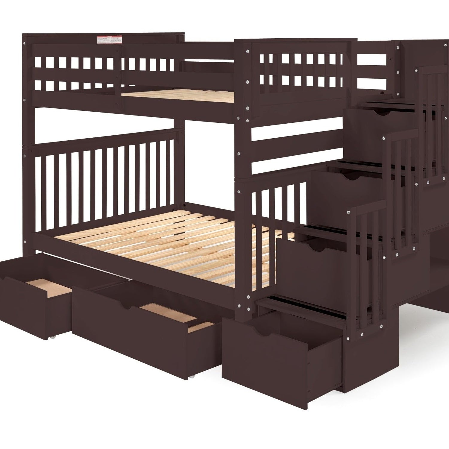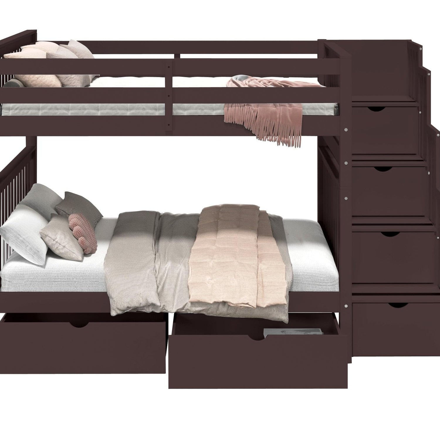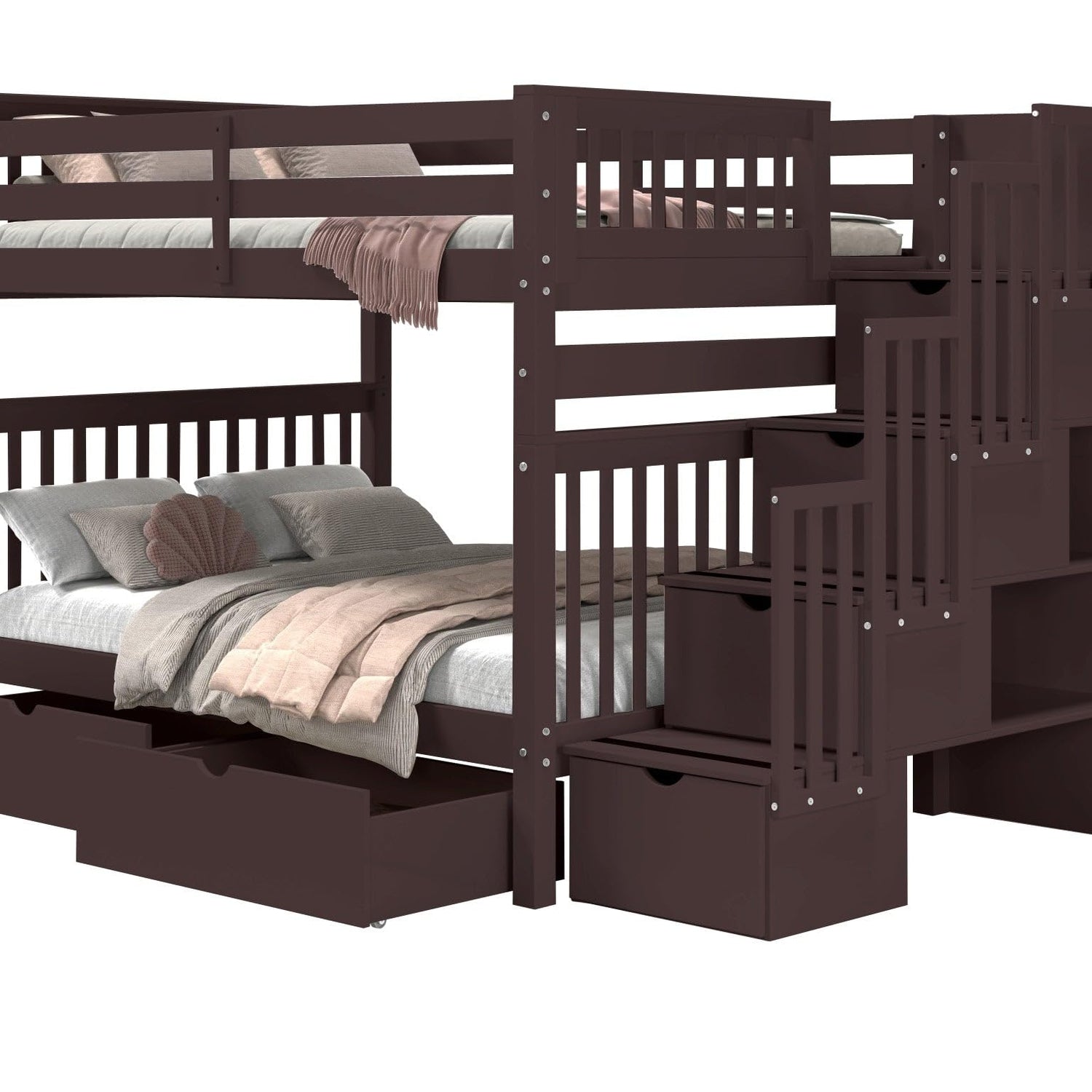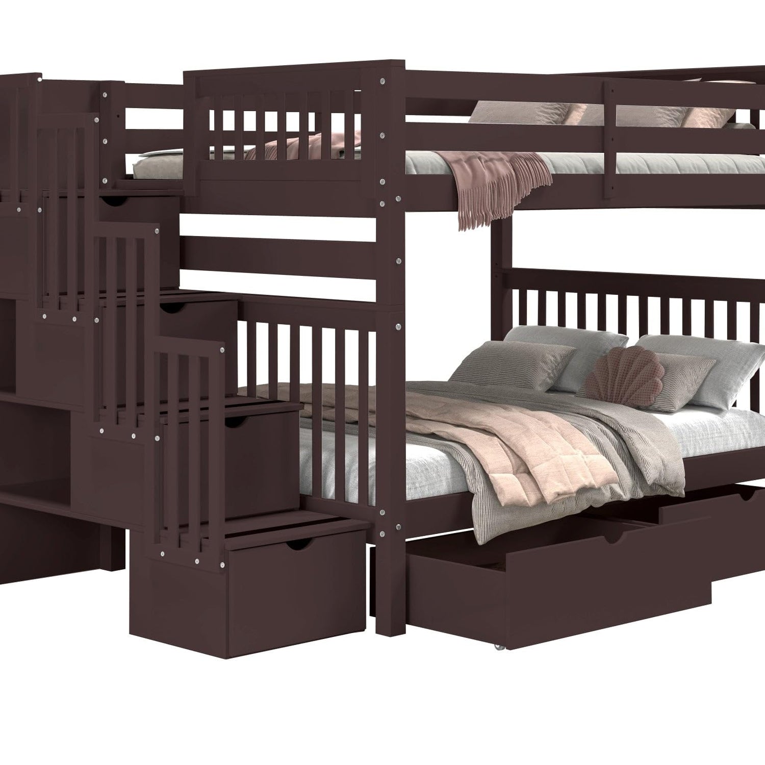 Bedz King Stairway Bunk Beds Full Over Full with 4 Drawers in The Steps and 2 Under Bed Drawers, Dark Cherry
