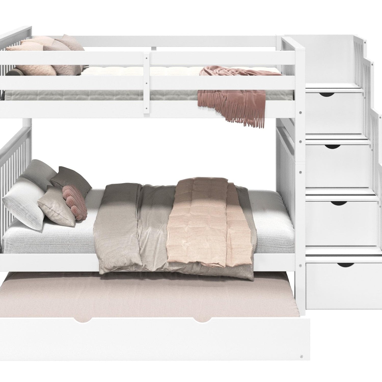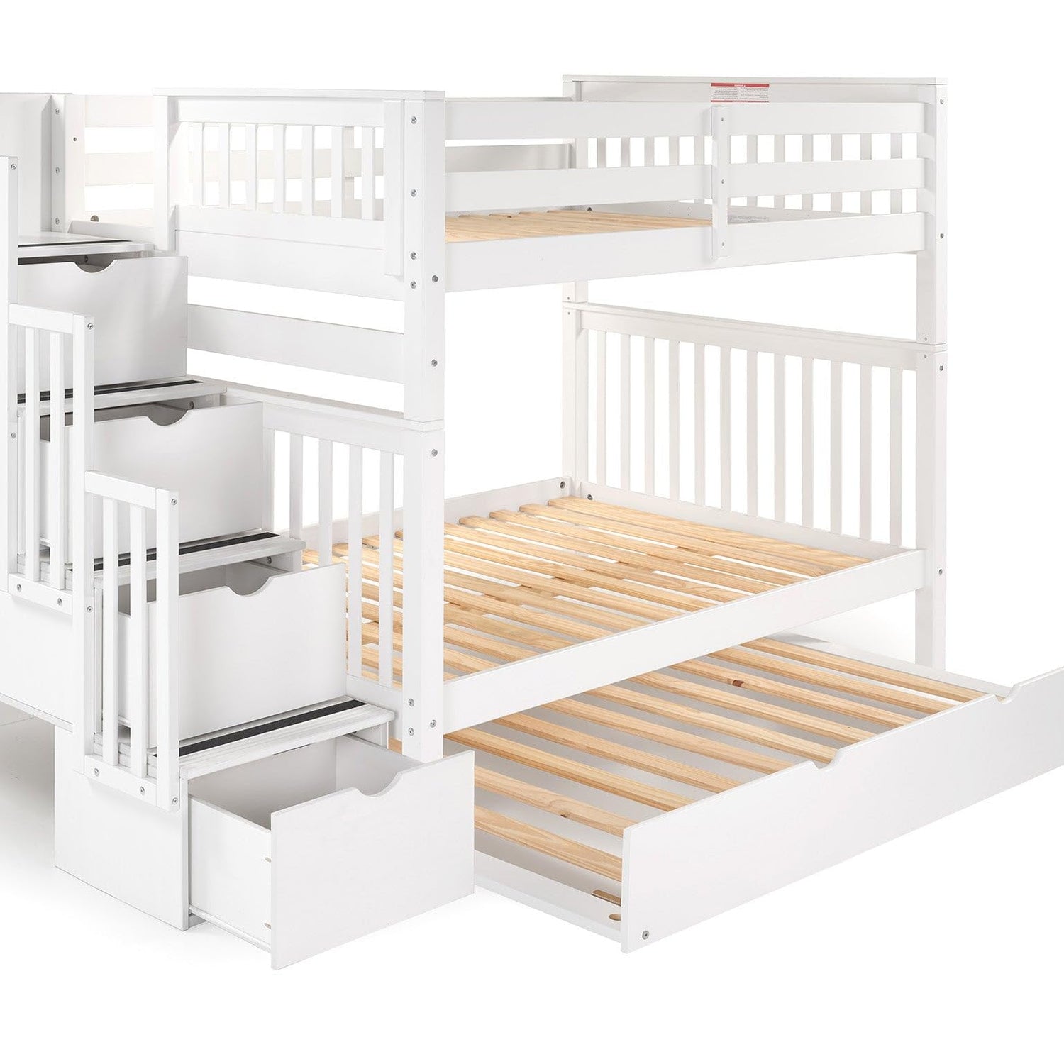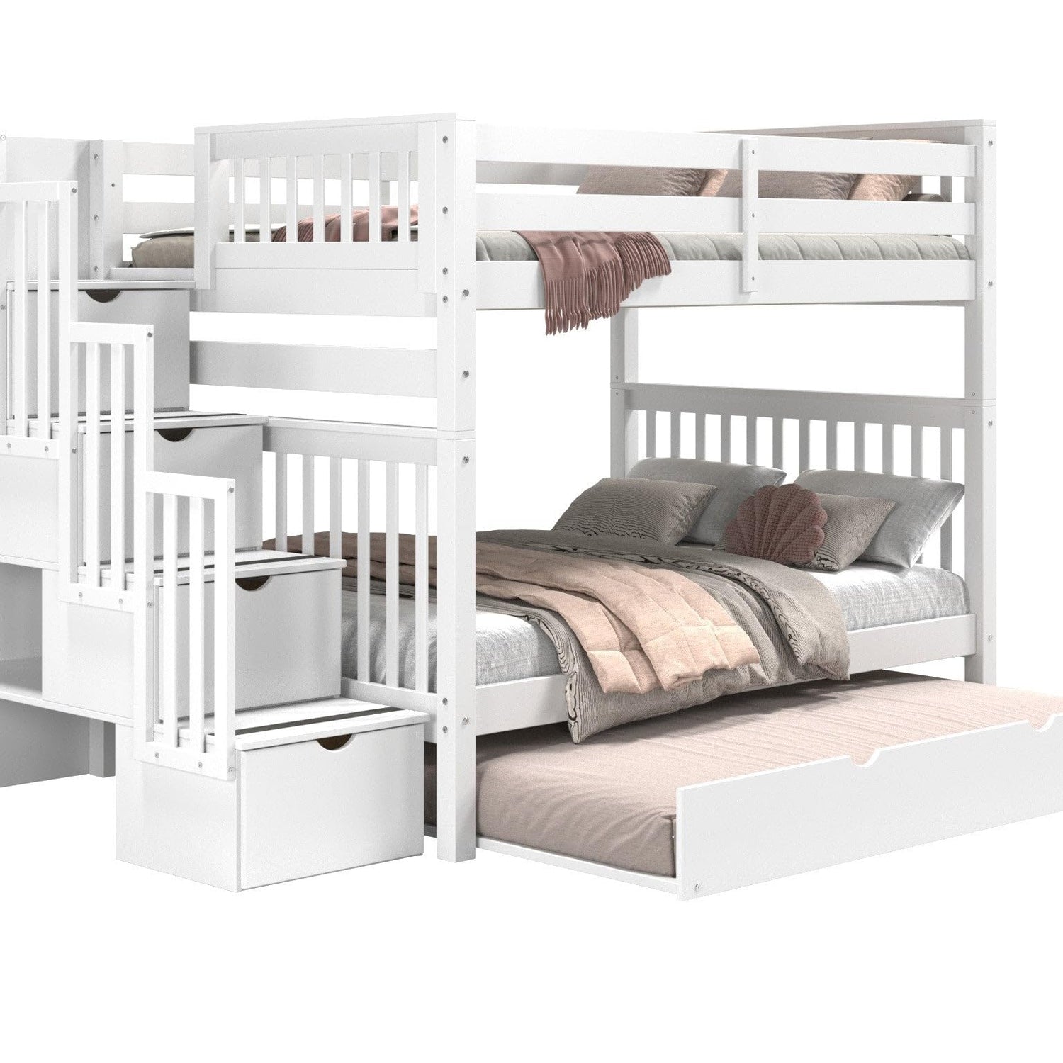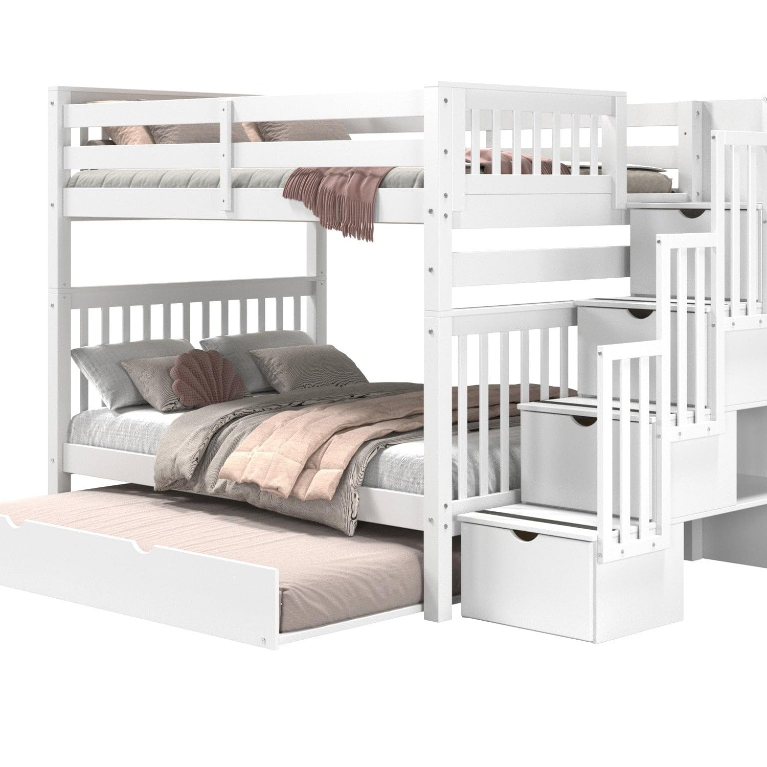 Bedz King Stairway Bunk Beds Full over Full with 4 Drawers in the Steps and a Twin Trundle, White