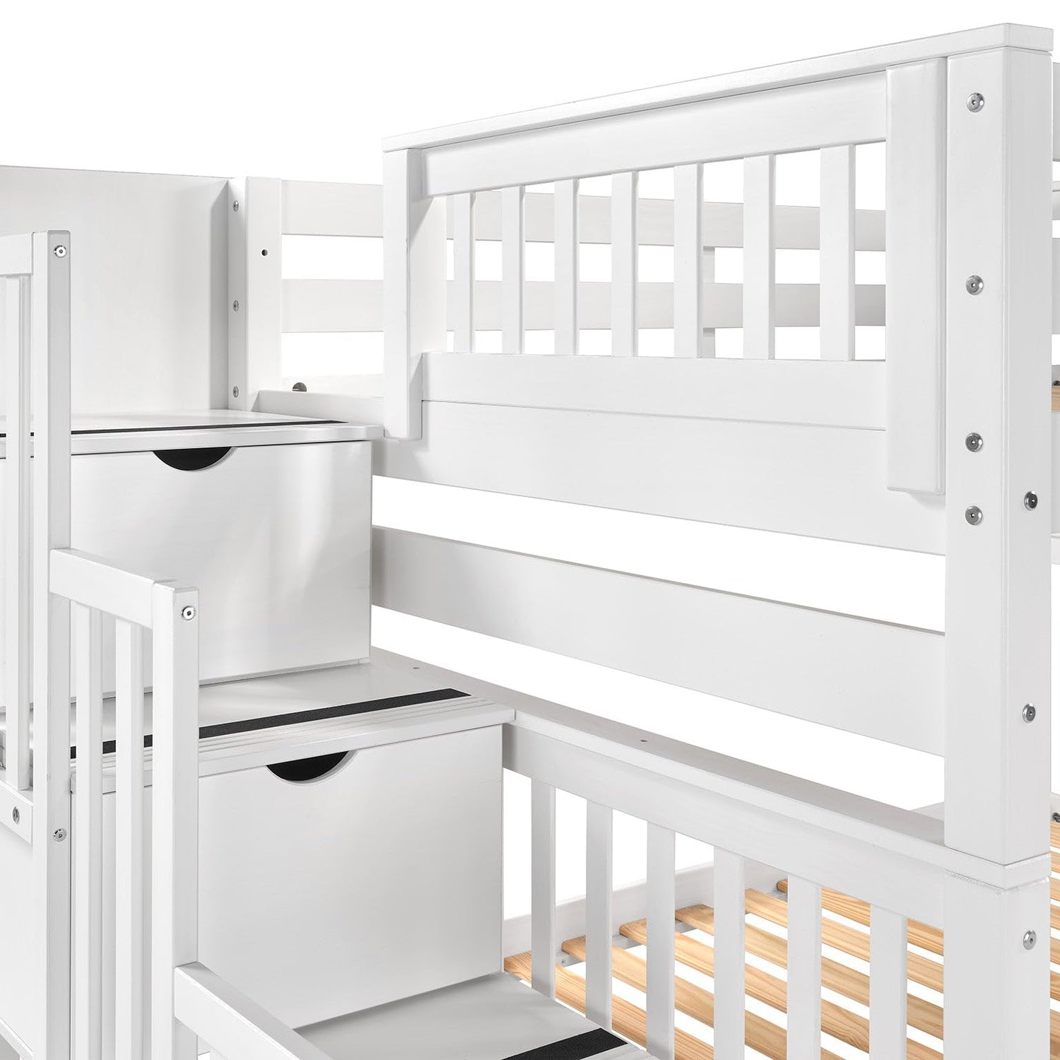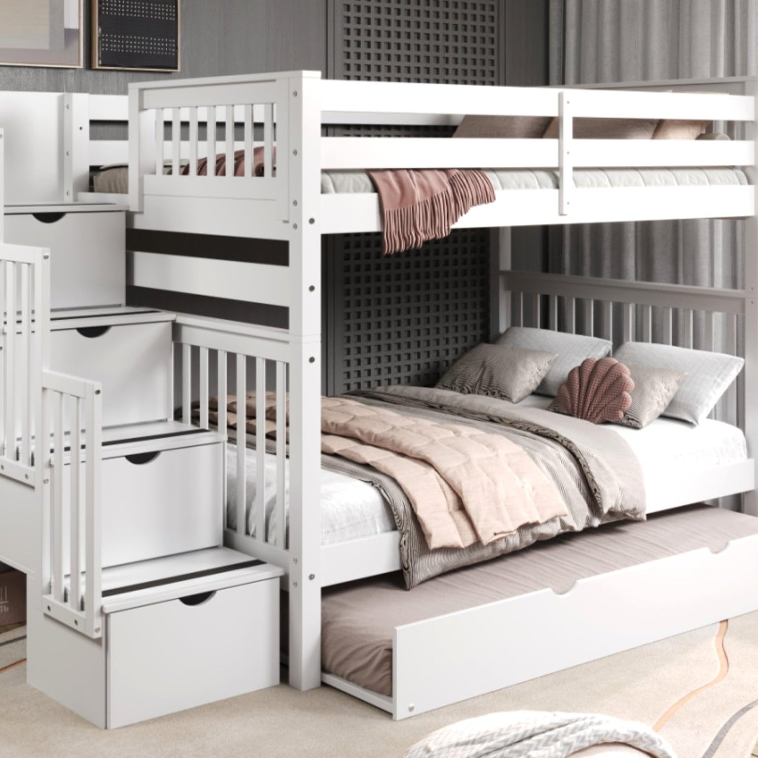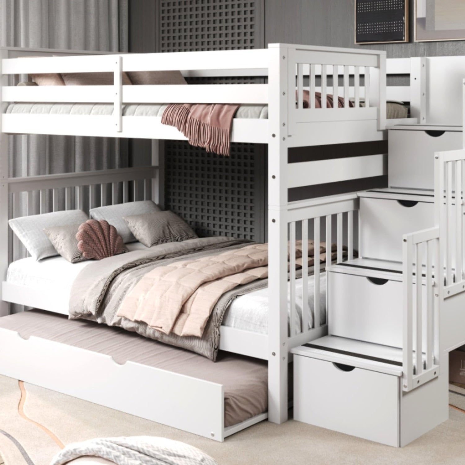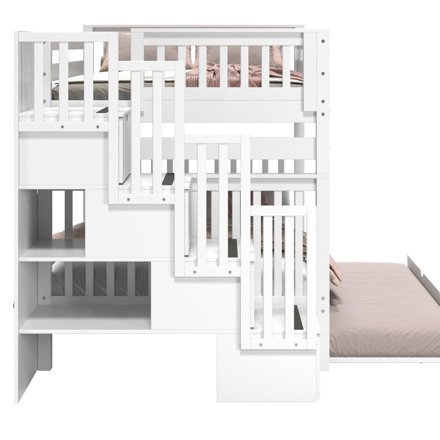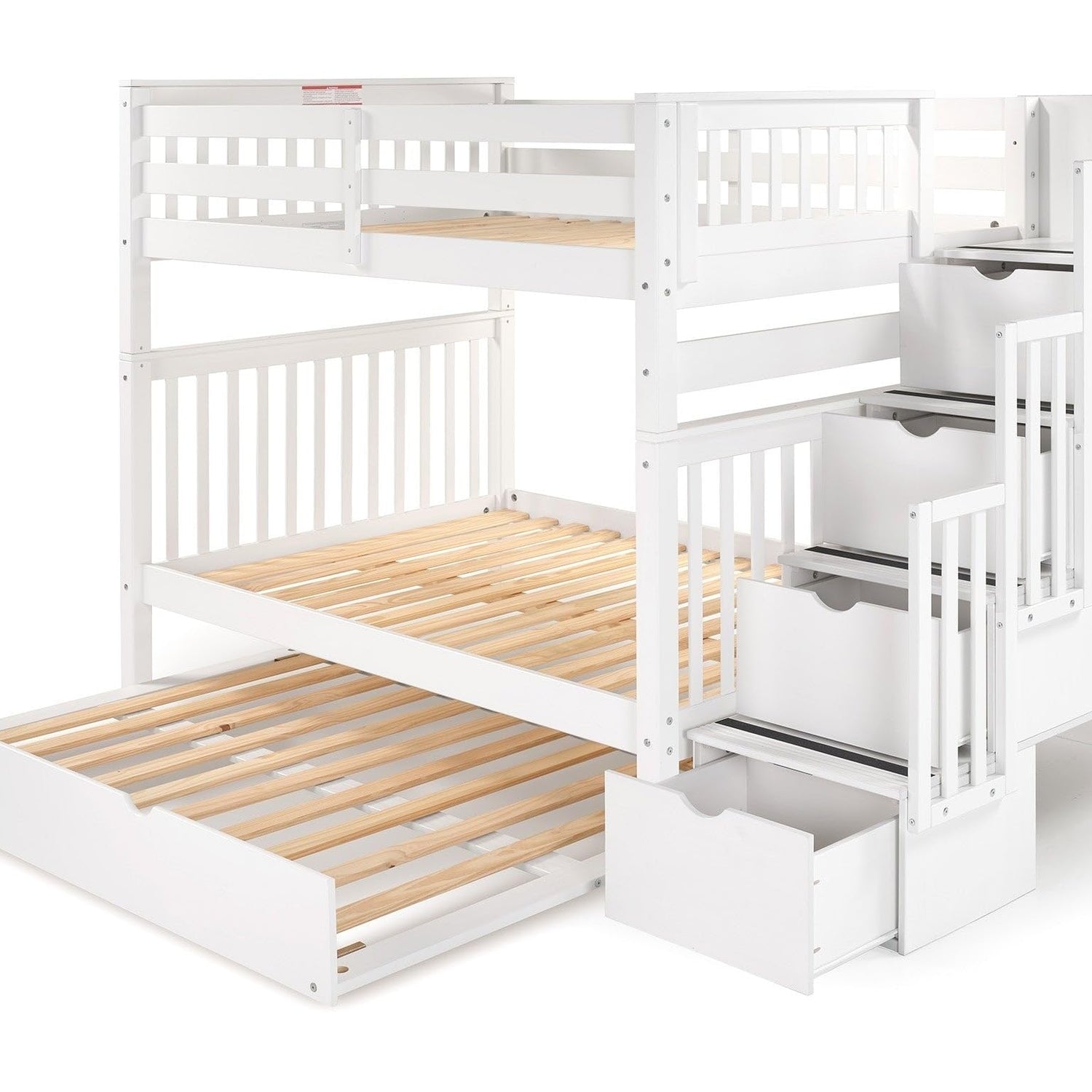 Bedz King Stairway Bunk Beds Full over Full with 4 Drawers in the Steps and a Twin Trundle, White