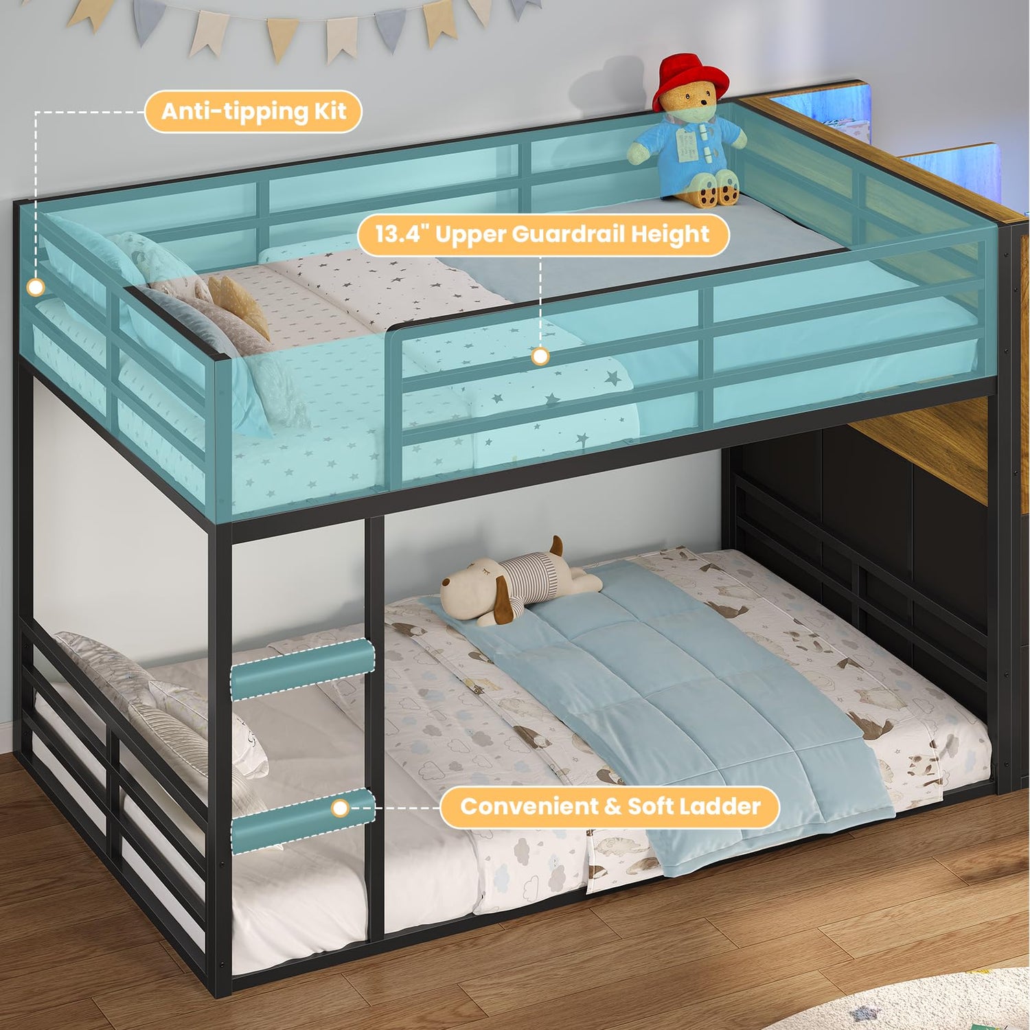 BTHFST Twin Over Twin Bunk Bed, Twin Bunk Beds with Storage & LED Lights, Metal Space Saving Low Bunk Bed with Safety Ladder and Guardrail