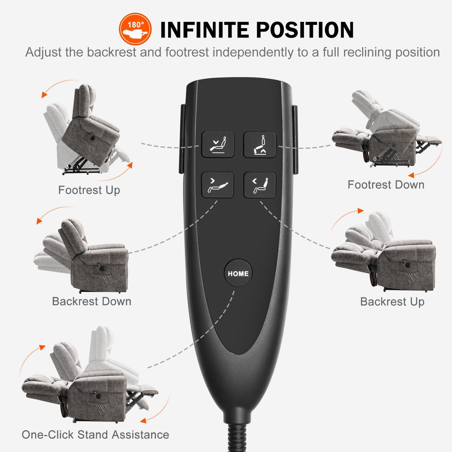 - 💺DUAL OKIN MOTORS: This lift chair is equipped with dual OKIN motors, allowing independent control of the backrest and footrest using a remote control. Easily customize the angle from 45° to 180° (Note: Backrest adjust: 100° to 180°, footrest: 90° to 180°). The chair's position locking is infinite, allowing it to lay flat like a bed, suitable for all age groups, and particularly convenient for seniors when standing. It is also perfect for individuals with leg/back issues or limited mobility.