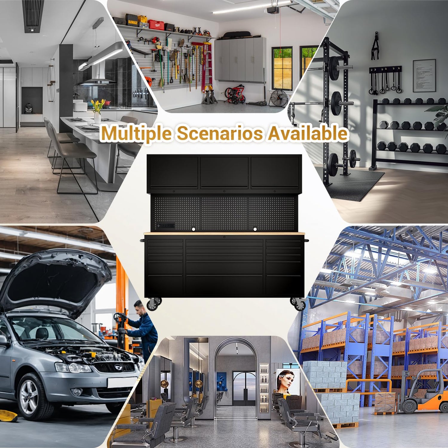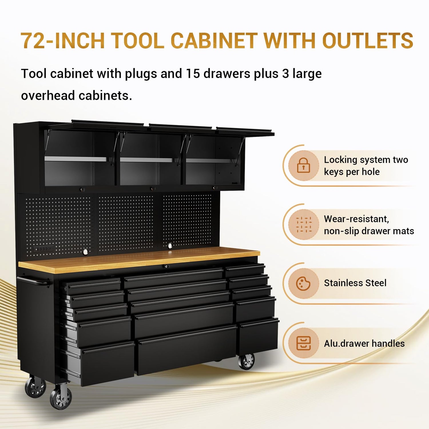 CHETTO C 72-inch Rolling Tool Chest Cabinet Mobile Workbench with 15 Storage Drawers and Wheels 3 Uper Cabinet Outlet SS Pegboard Black Tool Box for Garage
