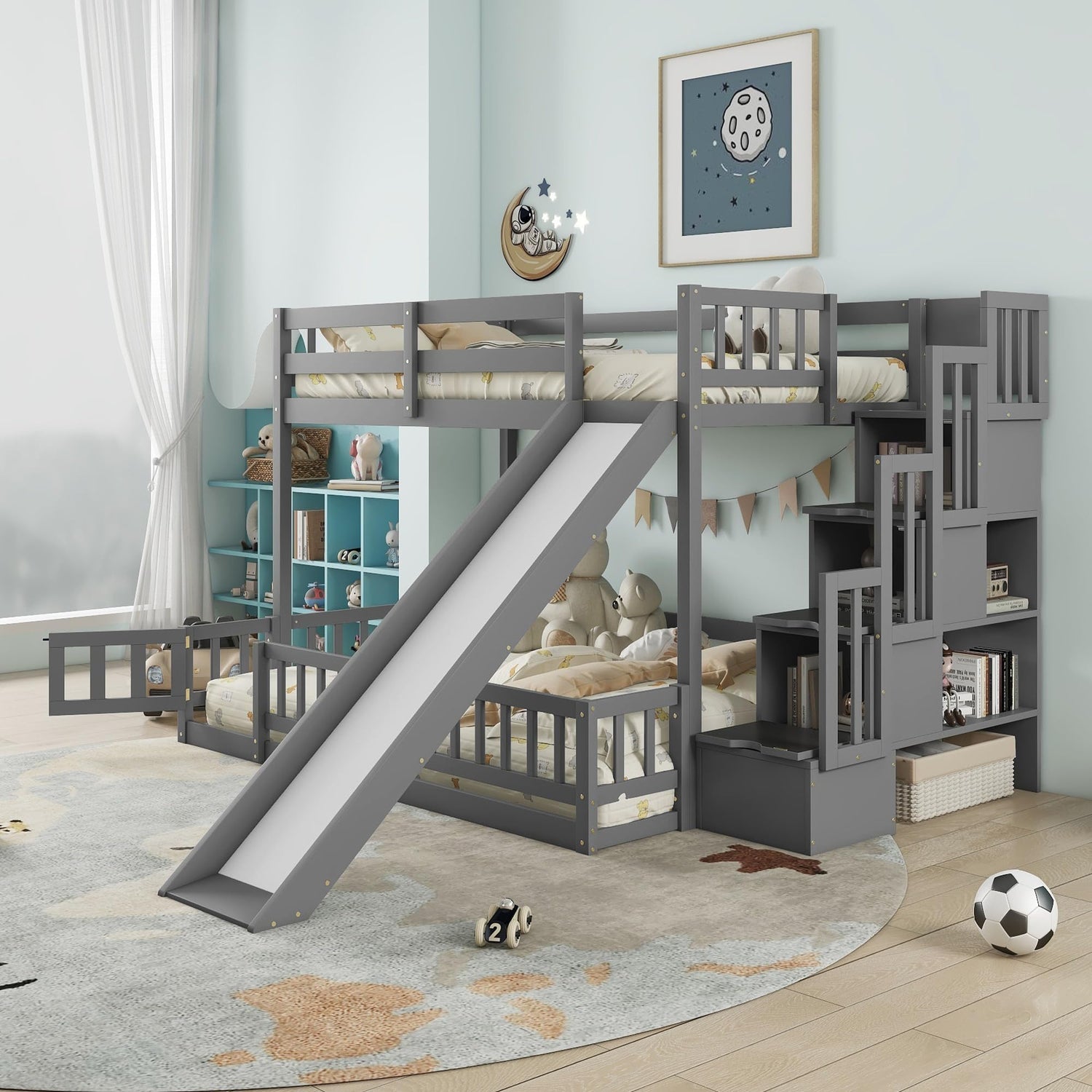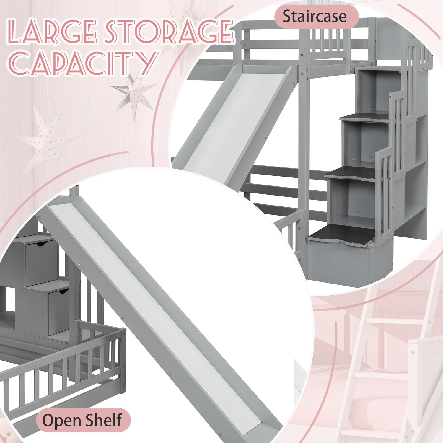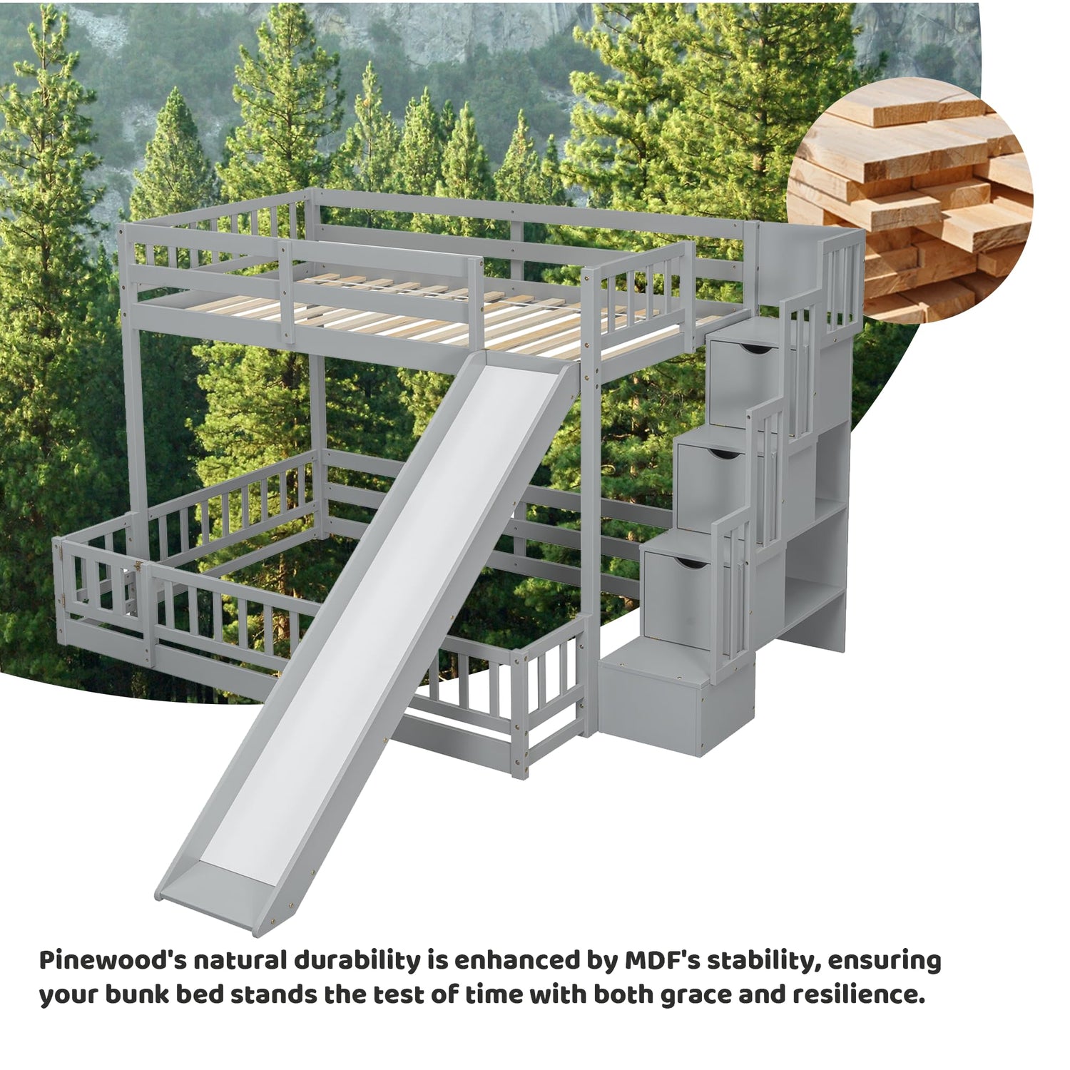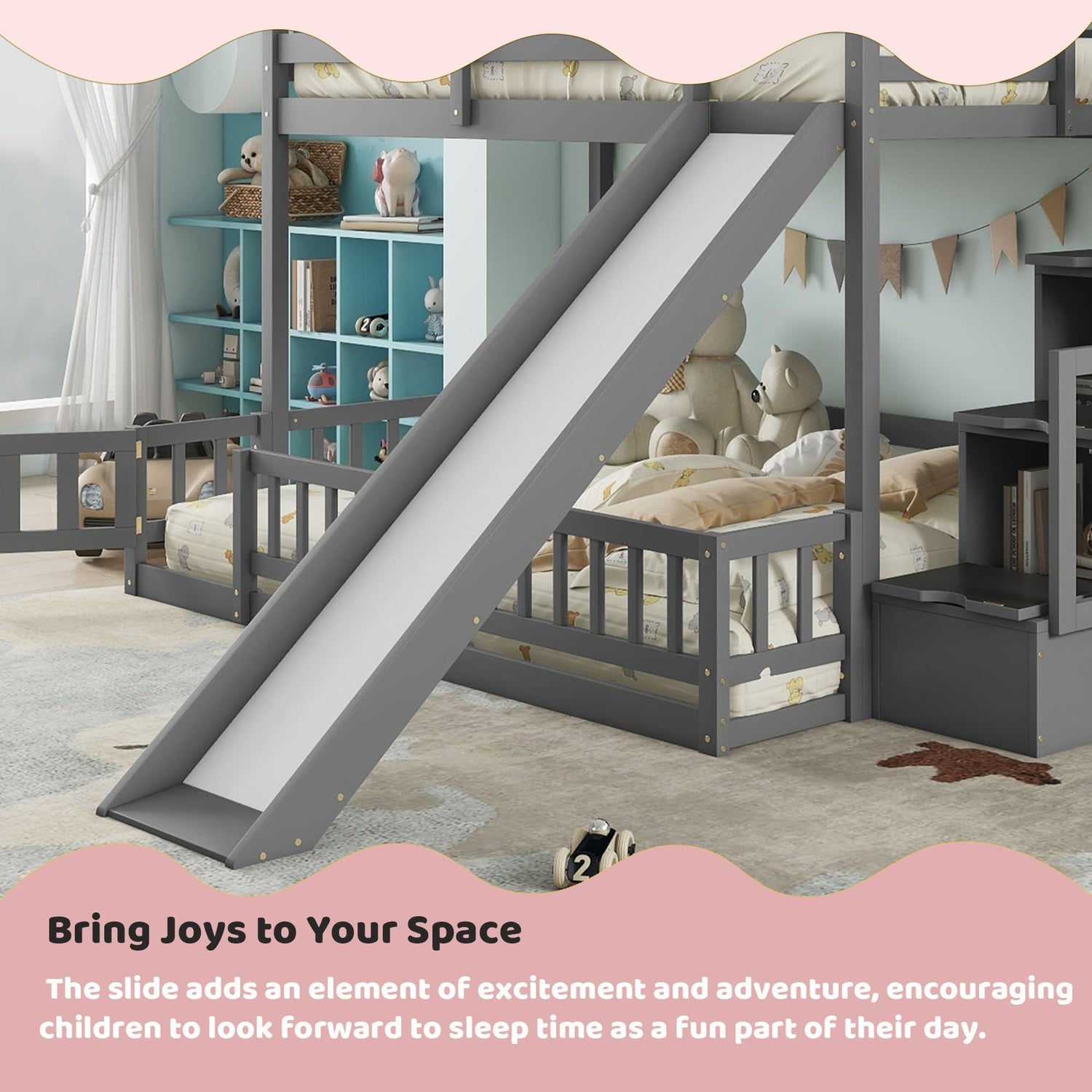 - 【Bunk Bed with Slide and Stairs】- This kids twin over full bunk bed built-in stairs and slide, it is easy for children to climb up and down from the top bed. Featuring a slide for kids to play, this wood bunk bed can add fun to children and develop their sense of balance and coordination.