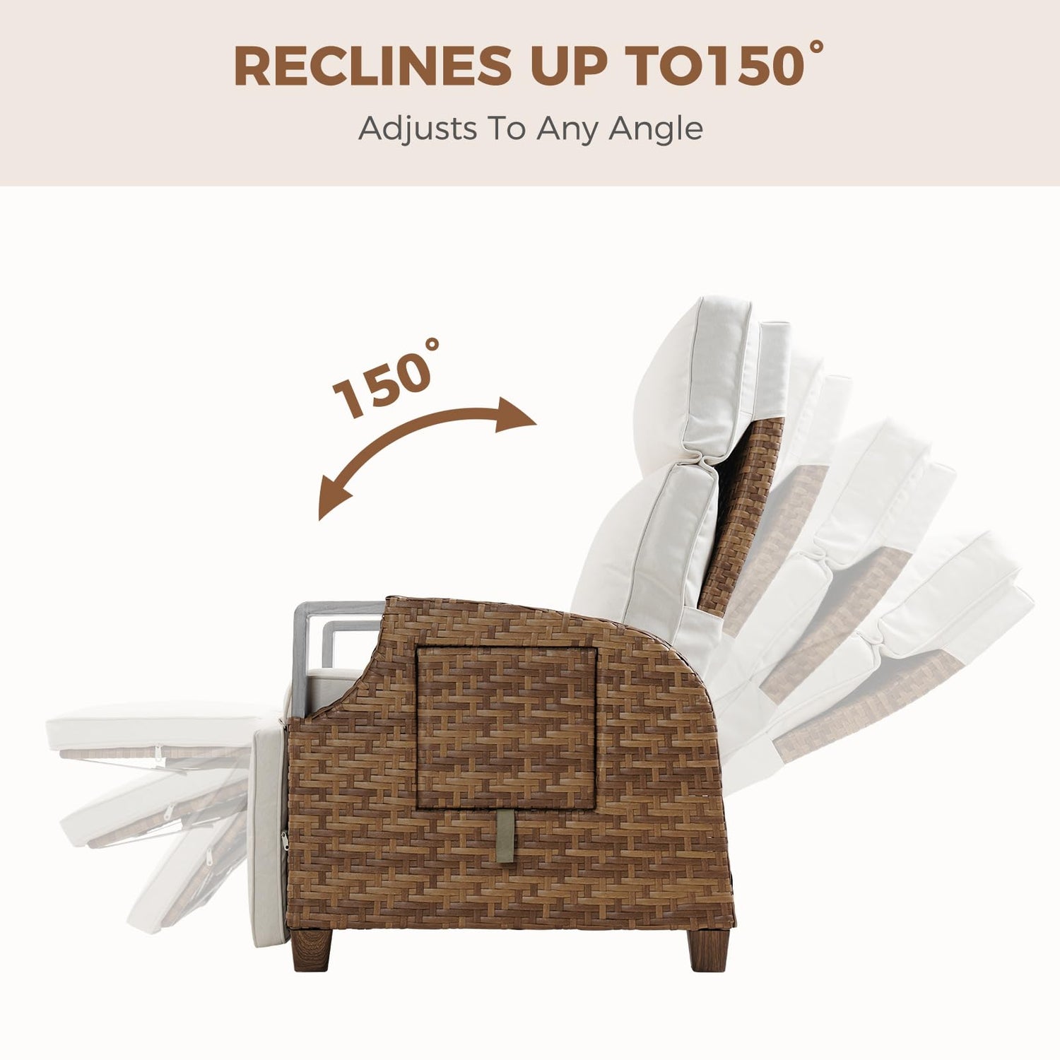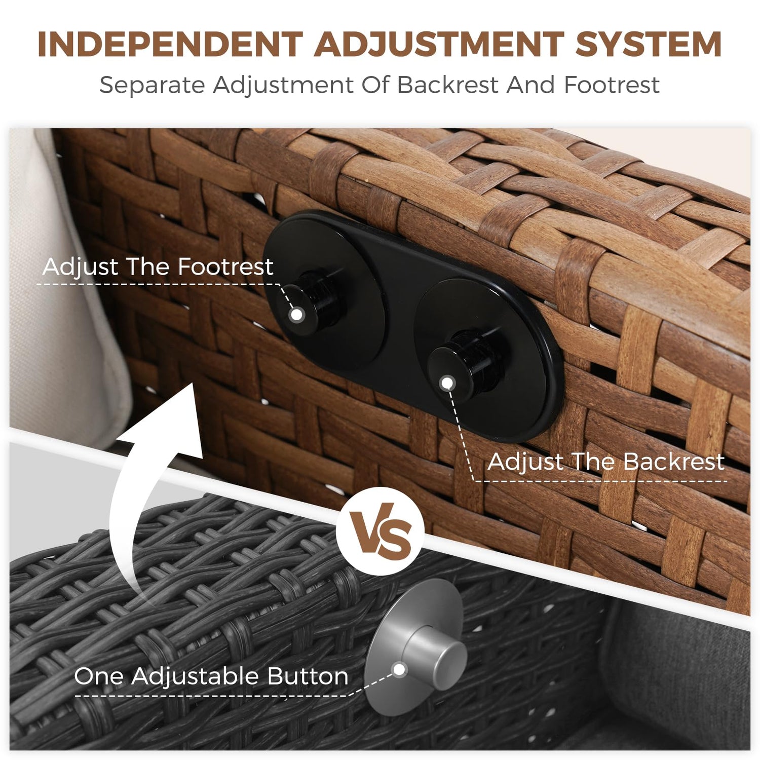- INDEPENDENT ADJUSTMENT: The backrest and footrest can be independently controlled by the two buttons on the inside of the armrest. This reclining patio chair offers 150 degrees of adjustable reclining comfort that can be locked into the desired position wh the touch of a button. Whether sitting or lying, it can effectively ensure all-rounded support, bringing a comfortable user experience