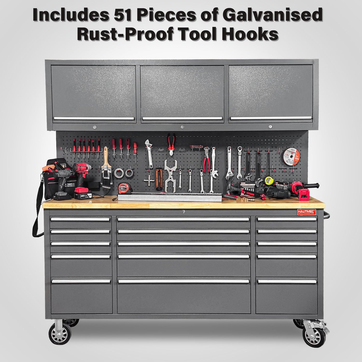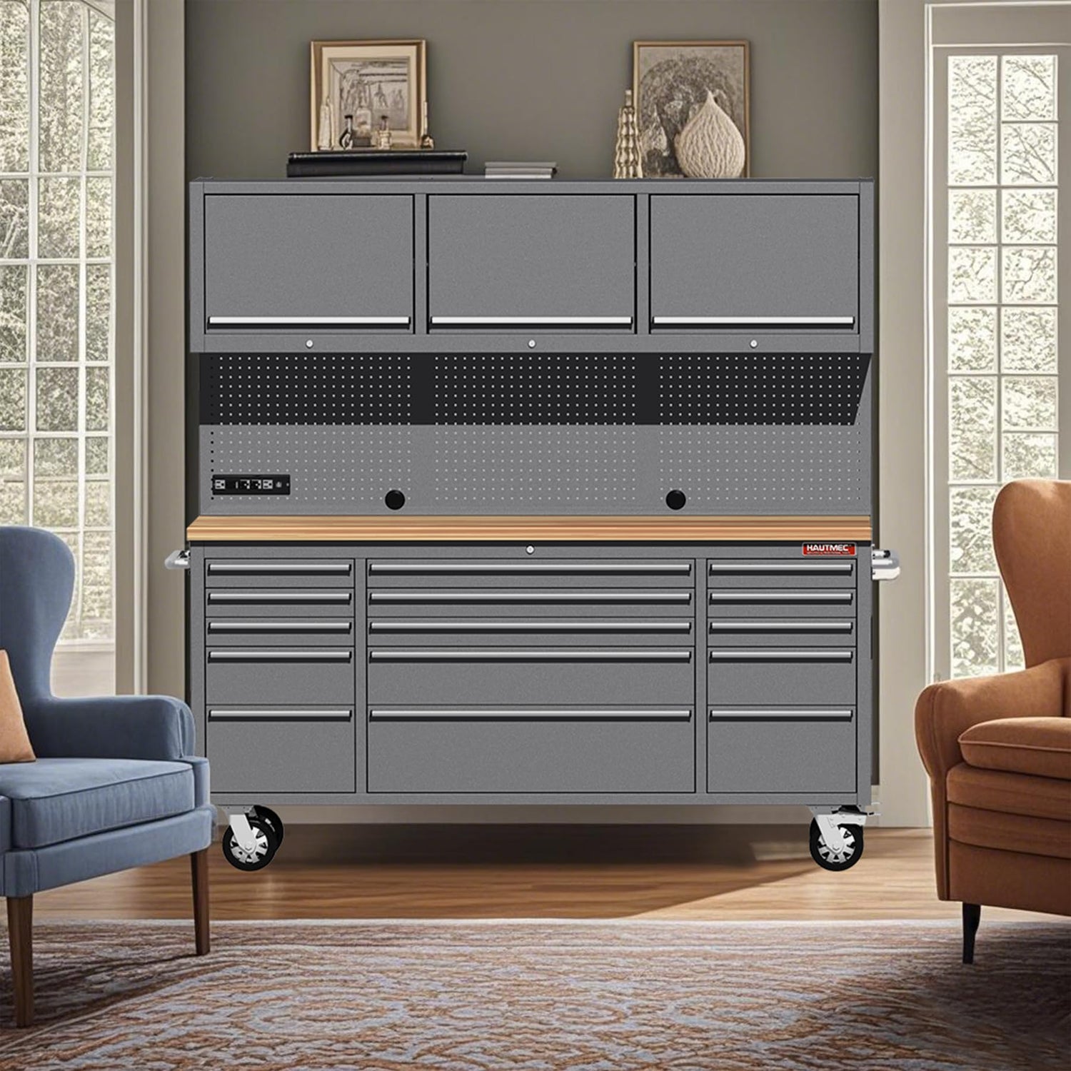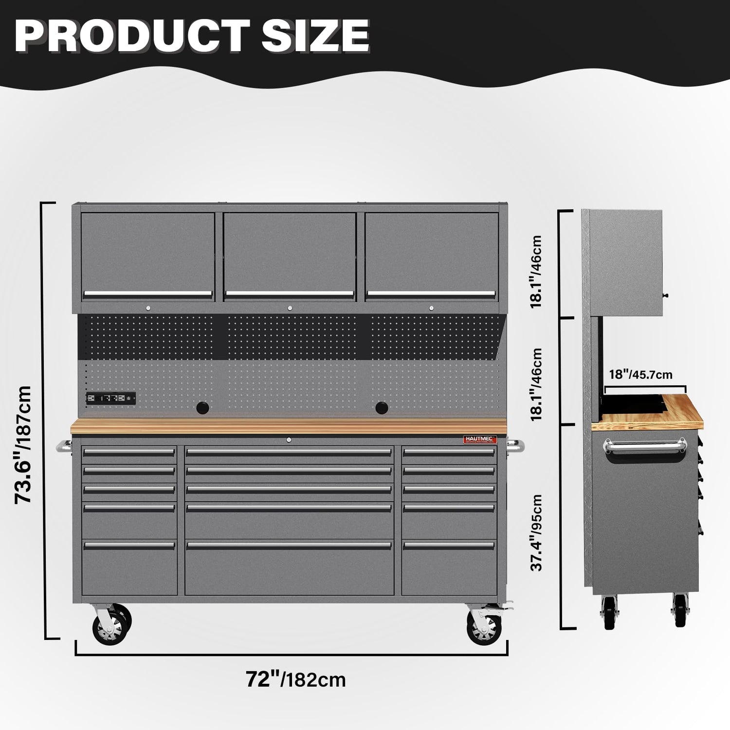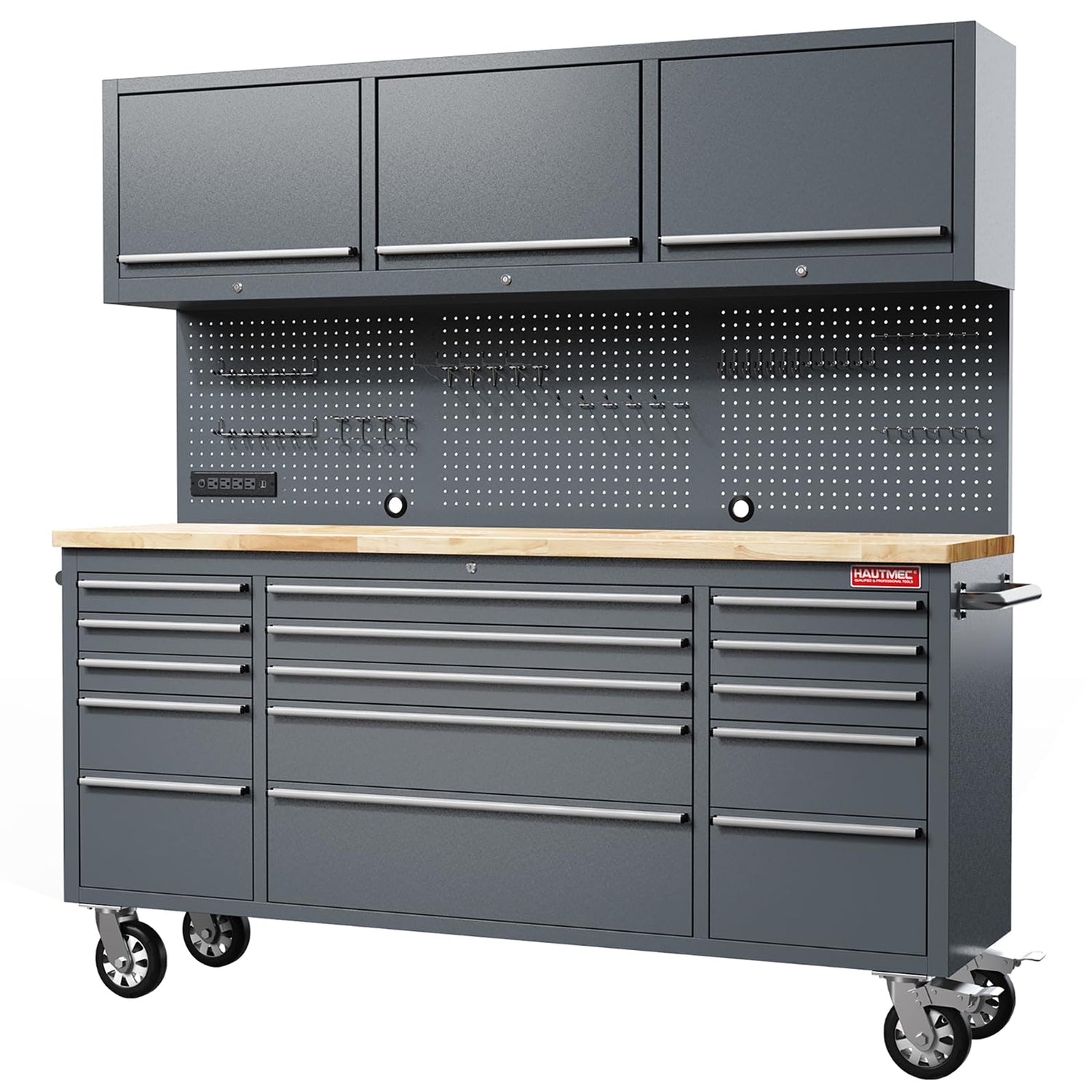 HAUTMEC 72" Rolling Tool Chest, Mobile Garage Workbench, Heavy-Duty Tool Cabinet on Wheels with 15 Drawers, 3 Upper Cabinets, Pegboard & 51 Hooks, Oak Work Surface & Power Strip – HT0428