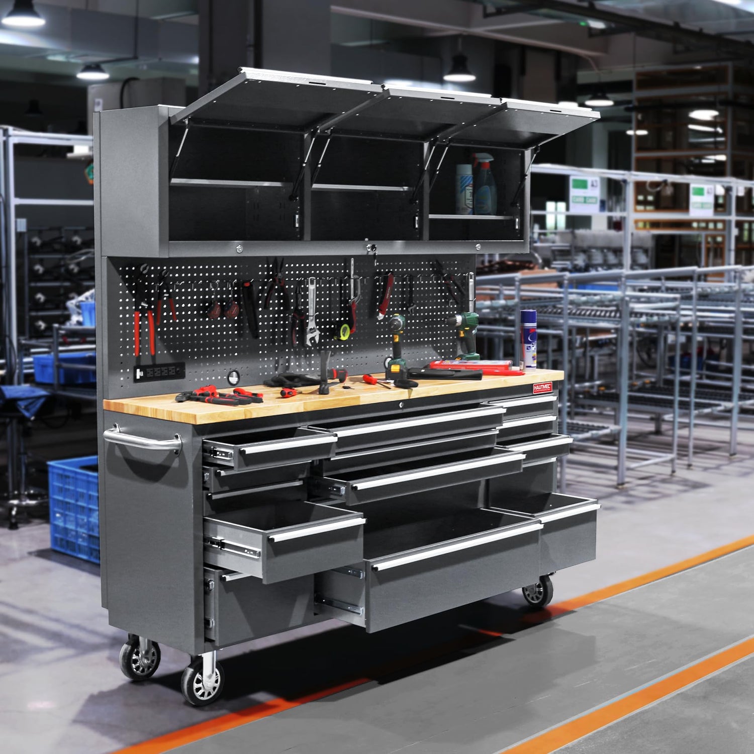 - 【Smooth & Secure Drawer System】All 15 drawers feature premium ball-bearing slides for silent, smooth operation. EVA liners prevent scratches and keep tools in place, while gas struts in the upper cabinets allow easy opening and closing