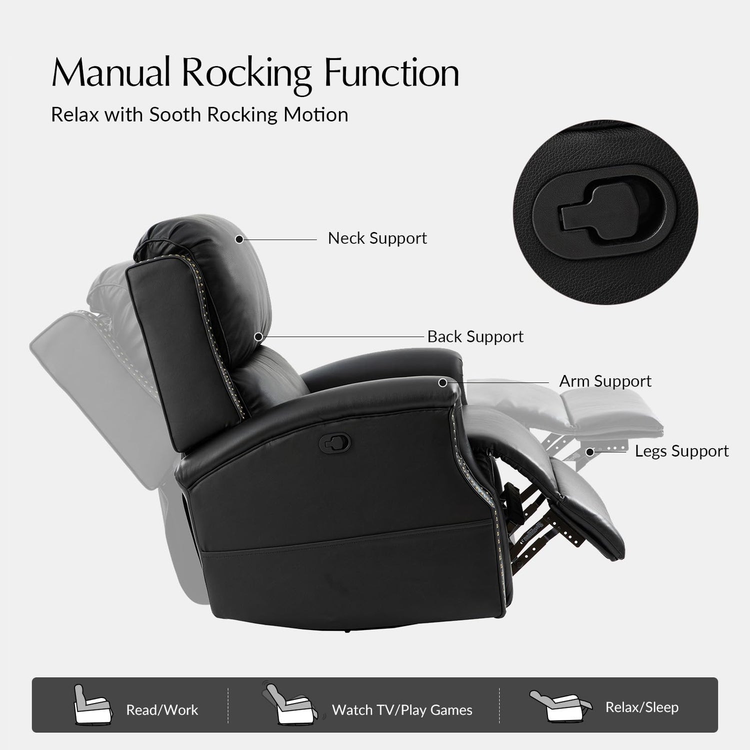 - Manual Rocking Function: Enjoy a soothing rocking motion for ultimate relaxation, perfect for unwinding after a long day.