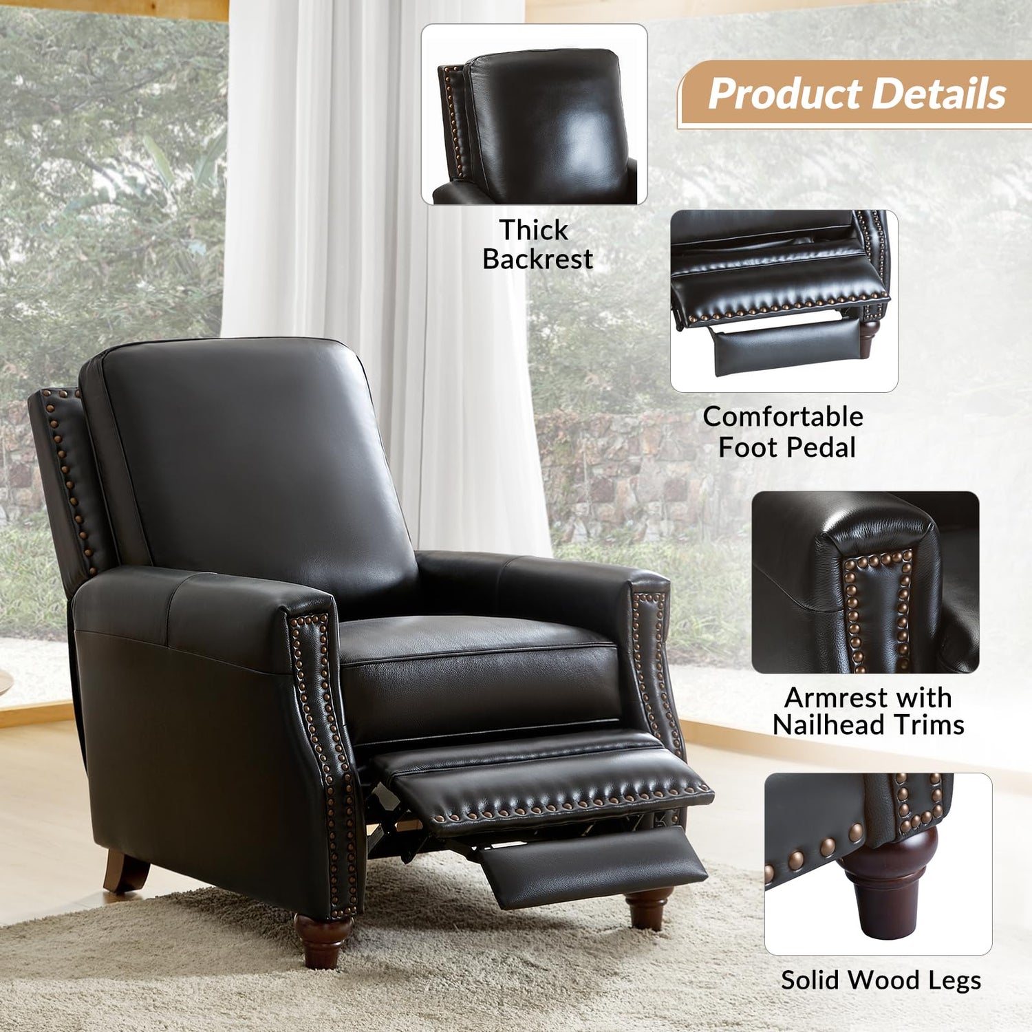 - Premium Top-Grain Leather & Modern Nailhead Accent:Handcrafted with genuine leather upholstery and vegan leather blend; Smooth finish resists stains and scratches; Classic nailhead trim outlines armrests and footrest for timeless elegance