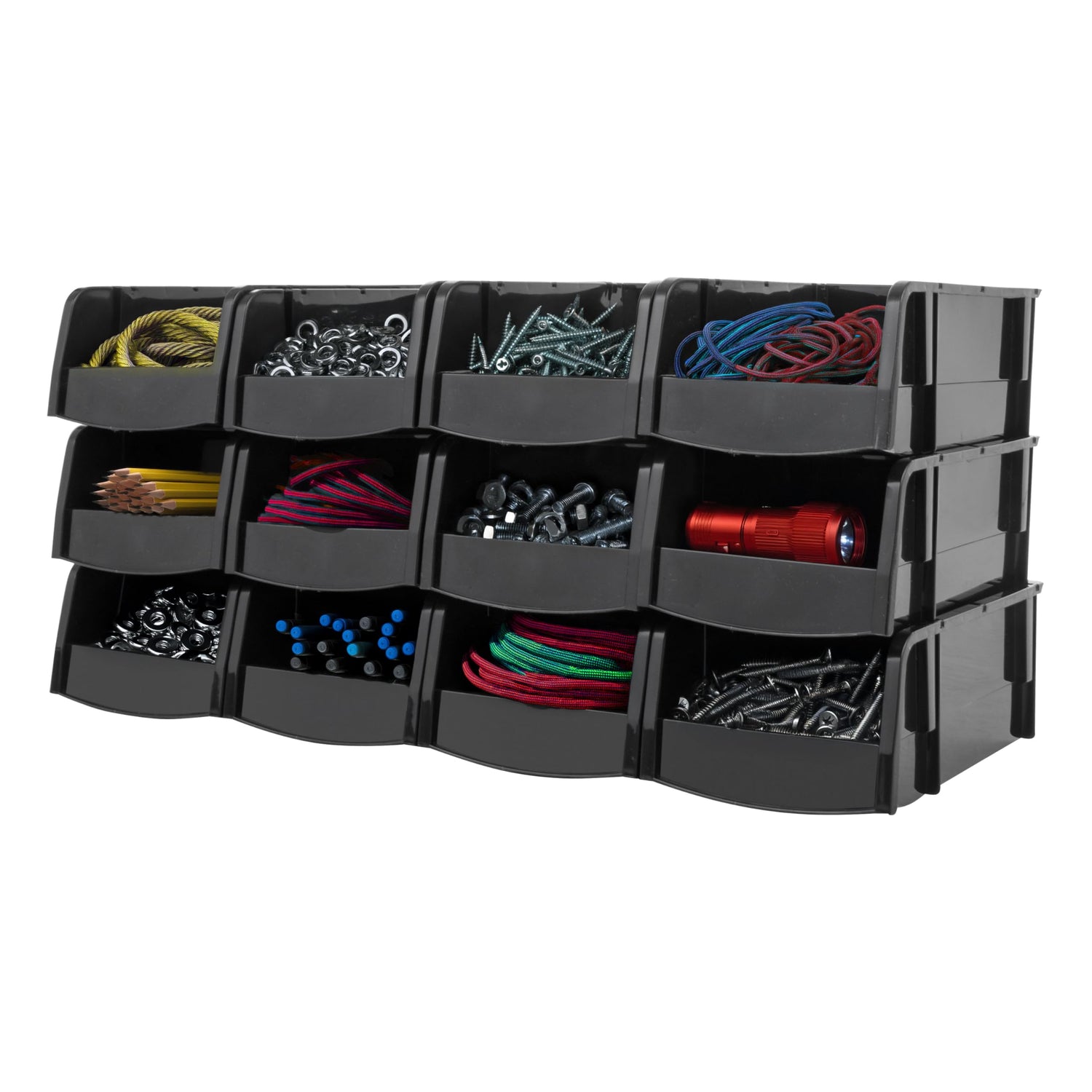 IRIS USA Small Stackable Storage Bins, 12-Pack, 7.5 x 4.5 x 3 inch, |Made in USA|, Plastic Open Front Shelf Bin for Organizing Parts, Hardware, Tools, Supplies, Garage Shelf, Pantry - Black