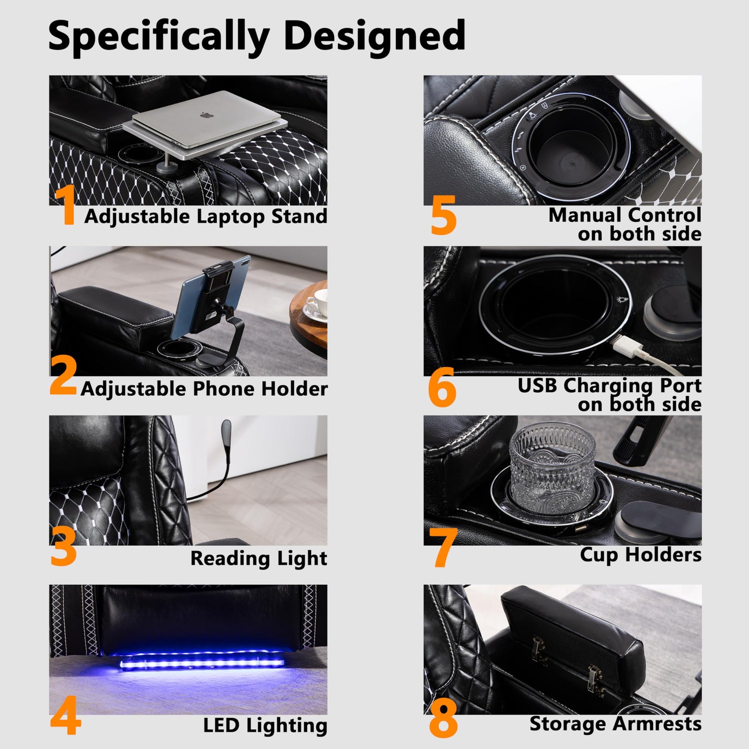 - 【Hidden Storage Armrest & Detachable Reading Light / Small Tabletop / Multifunctional Holder】More Convenient Designs:Both side armrests are with storage box, which can be used to put things to save space. The removable reading lights, small tabletop and multifunction holder can meet different needs in different environments. 2 built-in cup holders offer a supper theater experience at home.