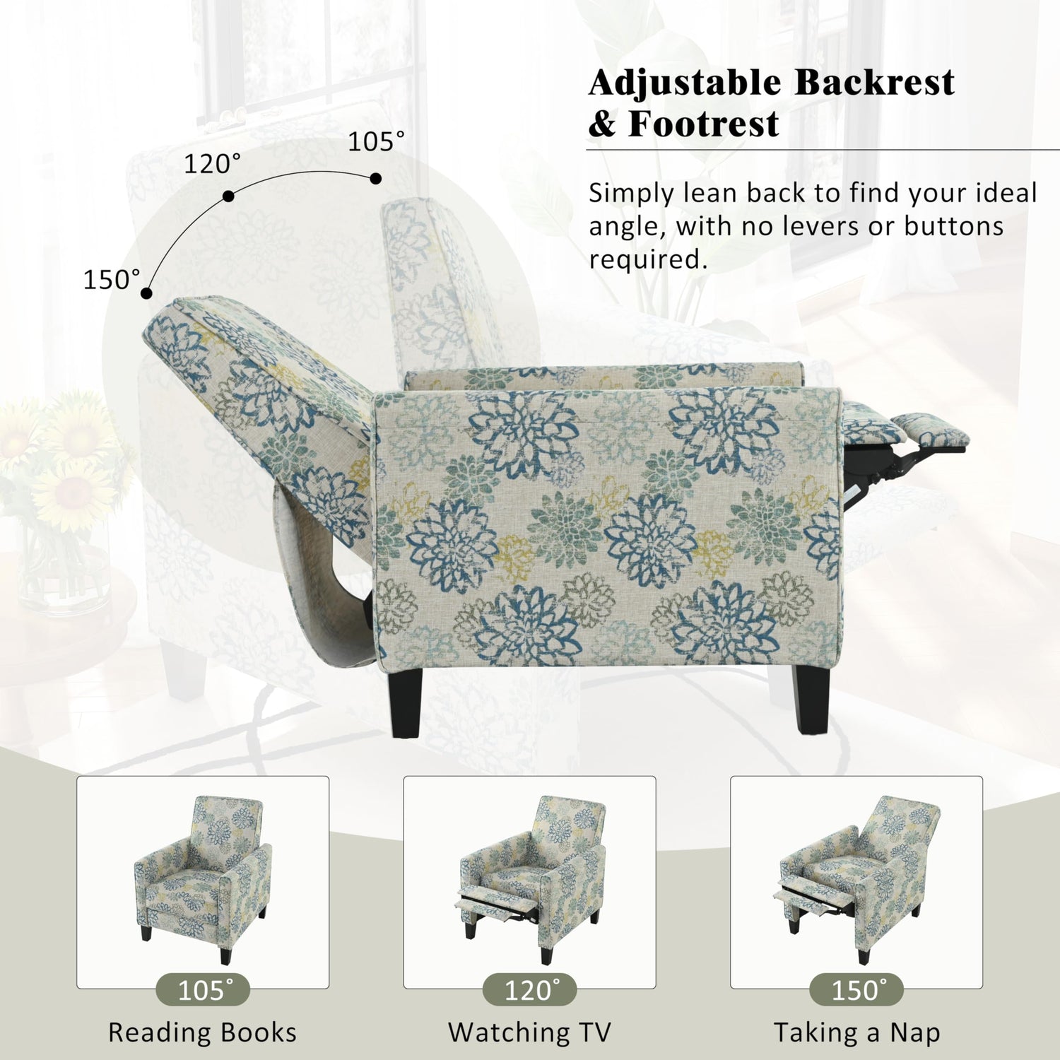 Details: Merax 27.5" Push Back Recliner Chair Upholstered Recliner Armchair with Solid Beech Wood Legs for Living Room and Bedroom, Light Brown&Blue
