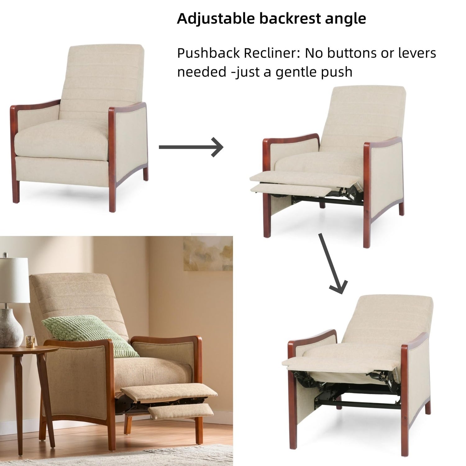 - Home Comfort Redefined: Experience luxury at home with our mid-century modern recliner chair. Its sleek wooden frame and channel stitching elevate any interior space, offering a haven of relaxation. With a smooth pushback reclining mechanism, once you're settled, you won't want to leave. Enjoy cozy movie nights and lazy days without stepping out.