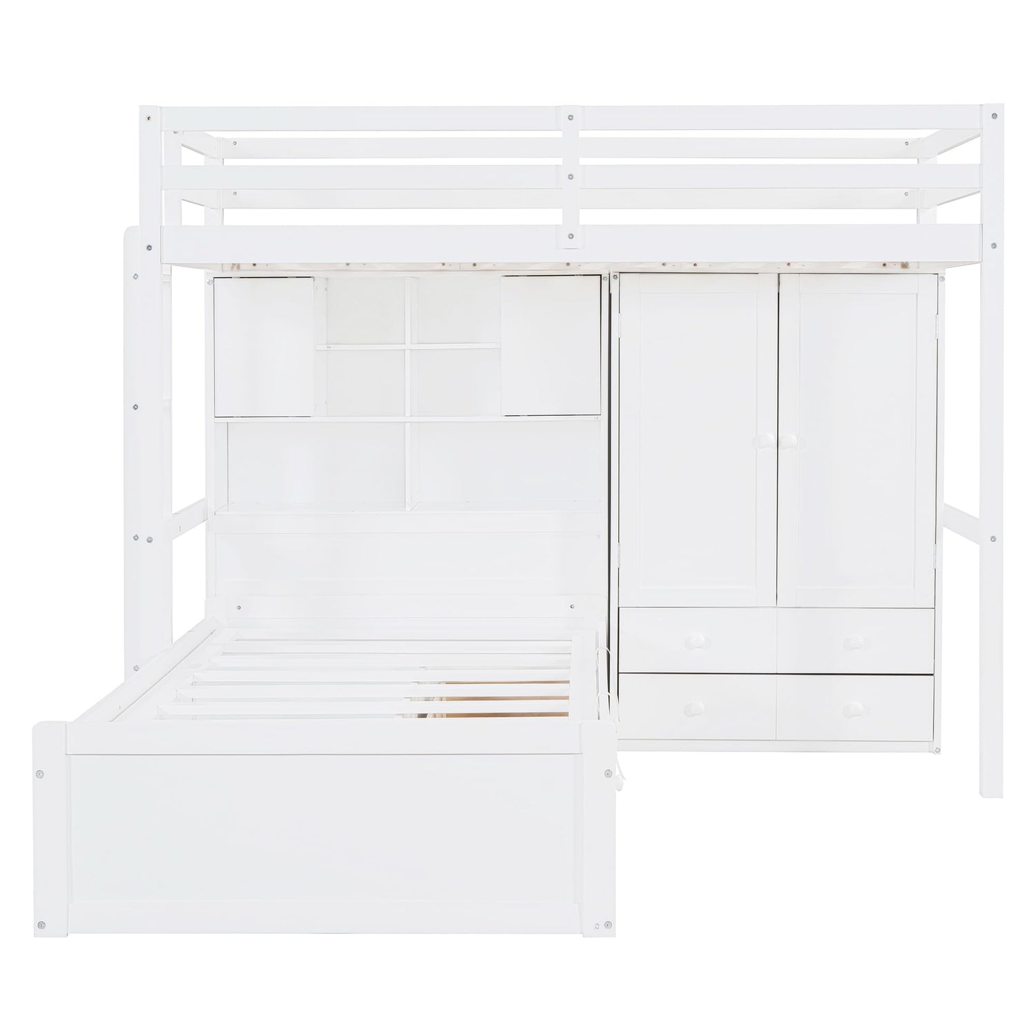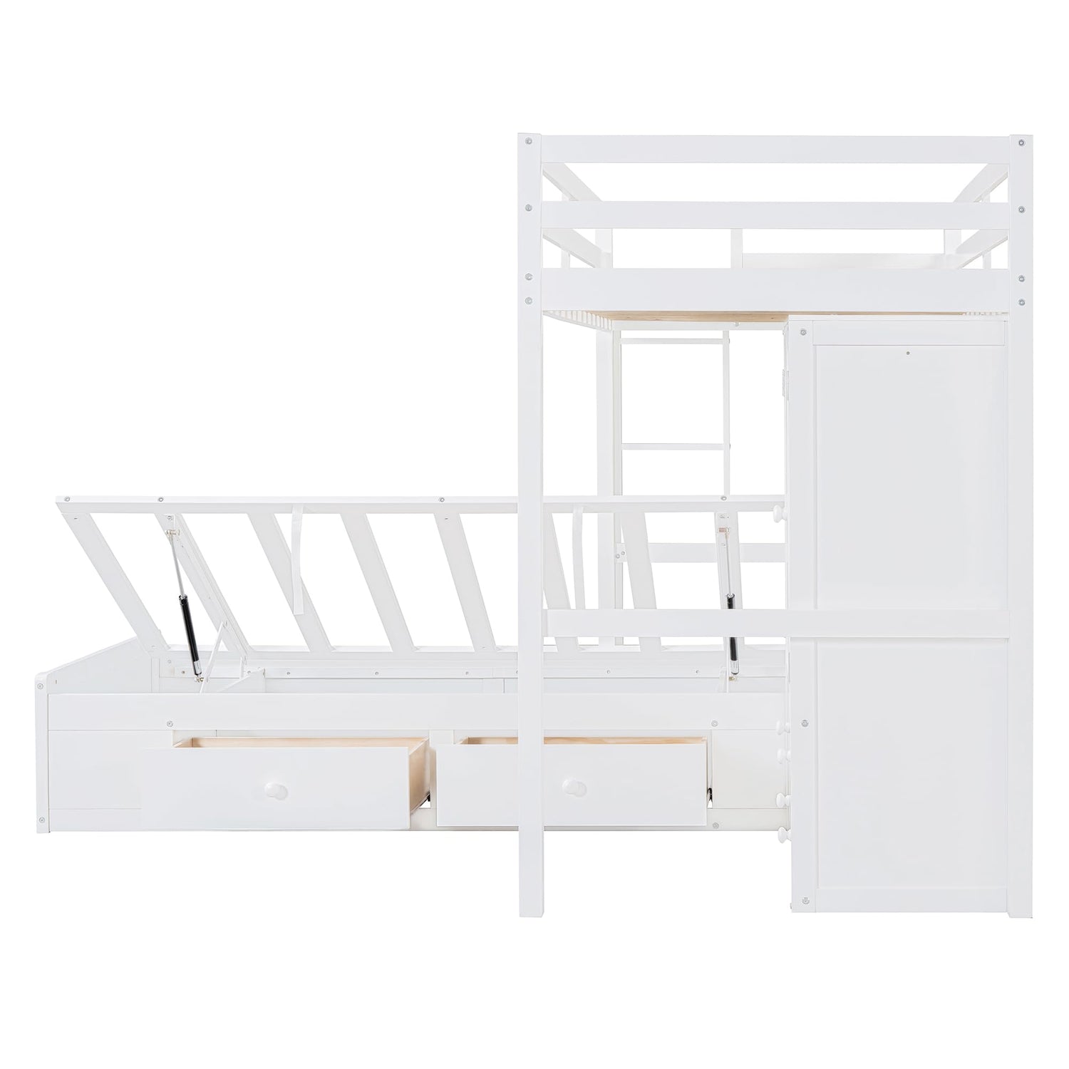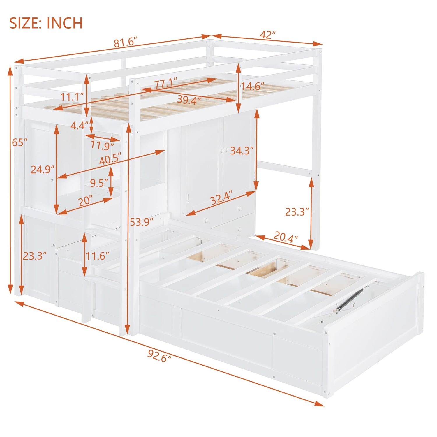 Merax Twin Bunk Bed with Drawers, Wood Twin Over Twin Bunk Bed with Wardrobe, Storage Shelves and Hydraulic Bed, White