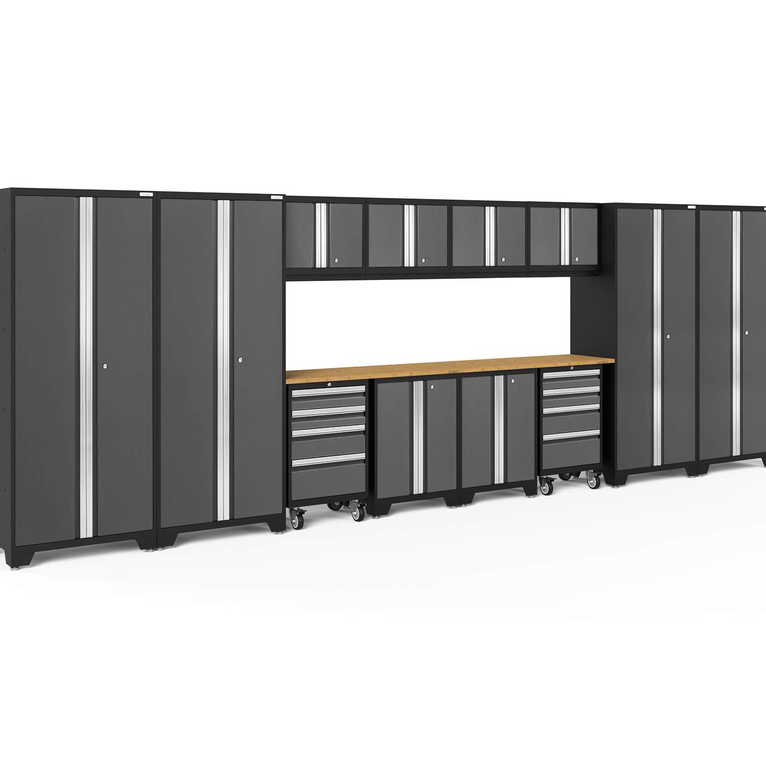 - Set Includes: 2x 48" Bamboo Worktops, 2x Rolling Tool Drawer Cabinets, 2x Two-Door Base Cabinets, 4x Multi-Use Lockers, 4x Wall Cabinets