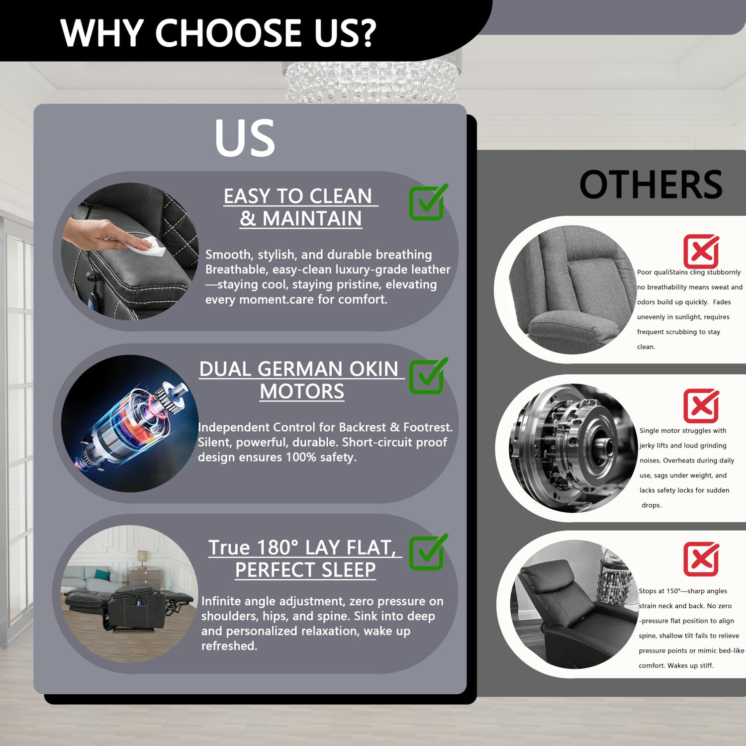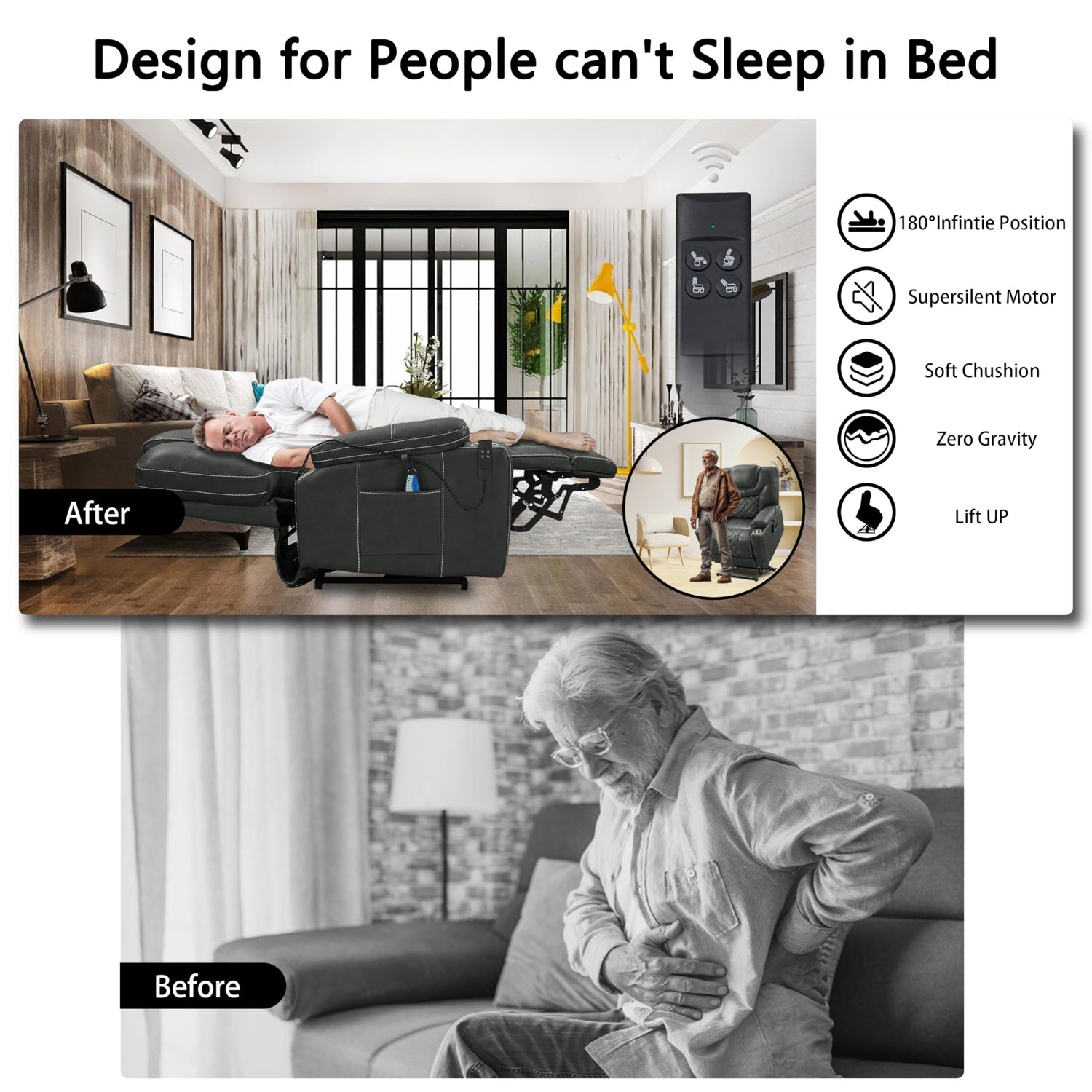 - DUAL OKIN MOTOR LIFT SLEEPING RECLINER: With the UL Approved German OKIN Silent Lift Motor and LVL system, the lift recliner chair reclines up to 180 degrees, so you can lie down and have a good sleep! The dual motors enable you independently control the seat back and the footrest to adjust the angle infinitely to keep the user in the most relaxed state. So say goodbye to back pain, waist pain or leg pain caused by uncomfortable sitting posture from today on!