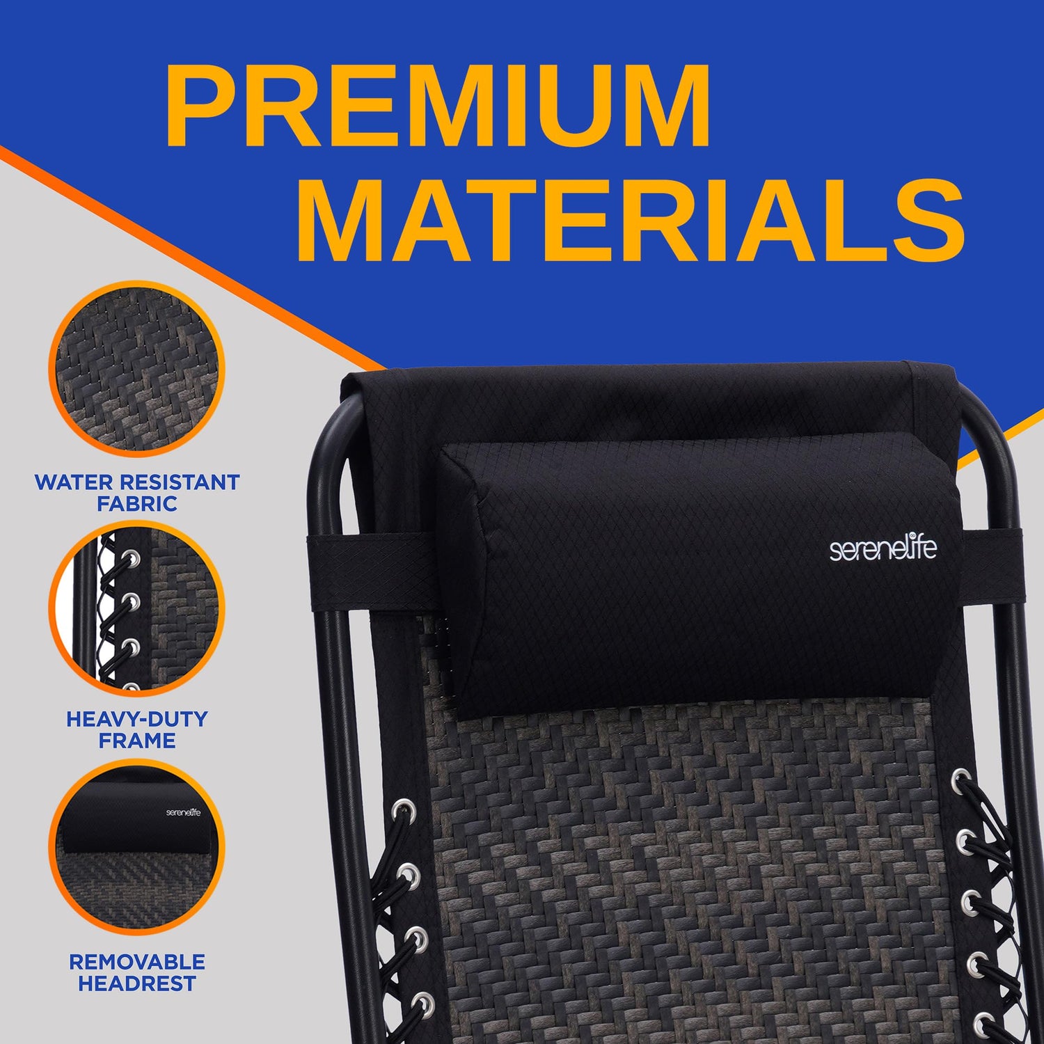 Details: Relax outdoors in style with the SereneLife Black Zero Gravity Lawn Chair. Made with durable black resin rattan and a sturdy steel frame, this adjustable foldable recliner delivers comfort and support for hours. The breathable fabric seat and removable padded headrest pillow keep you refreshed, while anti-slip feet provide stability. A detachable side table with cup holder allows easy access to drinks and snacks. Lightweight and portable, this chair is ideal for patios, gardens, beaches, and camping trips. Its lockable recline feature lets you adjust the chair to your perfect zero-gravity position.